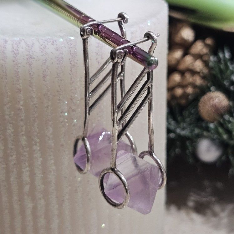 Sterling Silver .925 Raw Amethyst OR Fluorite Earrings Natural Cut Purple Rainbow Fractures - Crystals Rotate Freely / **DISCLAIMER: UNABLE TO DETERMINE WHETHER THIS CRYSTAL IS AMETHYST OR FLUORITE** / PLEASE REVIEW ALL PICTURES AS THEY ARE PART OF THE DESCRIPTION / Sold As Is - L0010