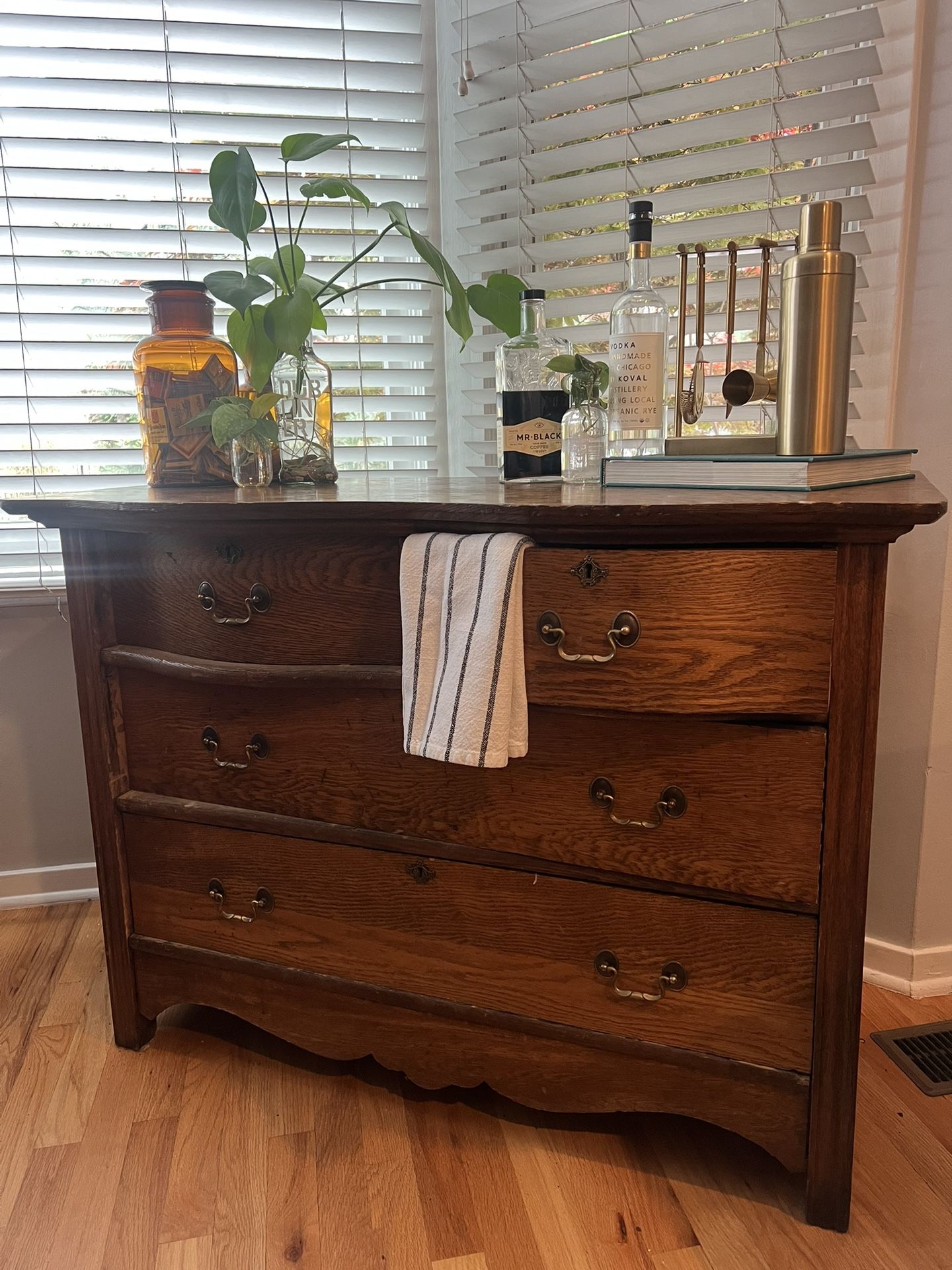 This beautiful antique dresser, believed to be from the late Victorian or early Edwardian era, it offers classic style and enduring craftsmanship. It features a unique scalloped top and four spacious drawers: two smaller drawers on top and two larger, deep drawers below, providing ample storage. The drawers are constructed with robust Knapp joints (pin-and-cove), a hallmark of quality antique furniture. Dimensions: 42.5" W x 31" H x 21.25" D (at widest point of scalloped top) Condition: In good antique condition, showing age-appropriate wear that adds to its charm and character. This piece is ready to bring timeless elegance to your home! Perfect as a bedroom dresser, an entry hall console, or a unique accent piece in any room. Pickup preferred or $50 delivery fee. Serious inquiries please.