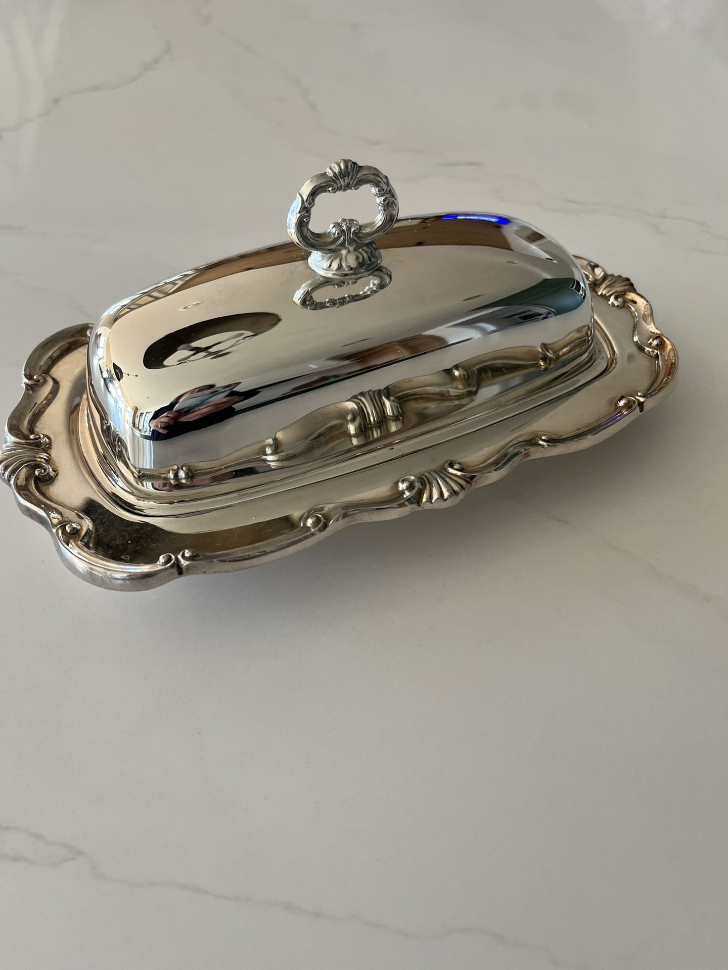 Pretty and in excellent condition a covered butter dish. Silver base and cover includes a glass dish for butter.