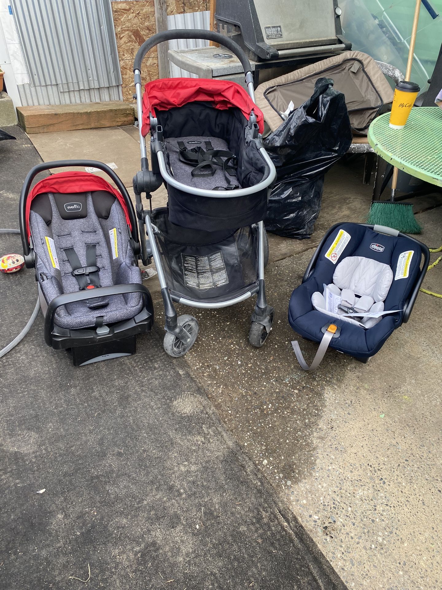 Used once baby stroller system and chicco car seat never used still new with tags. Need to sell moving and it would be nice for a new to be family. Take all for $150 the Evenflo pivot system retails at almost $400.The Chicco car seat that is still new and never used, It retails at $300.