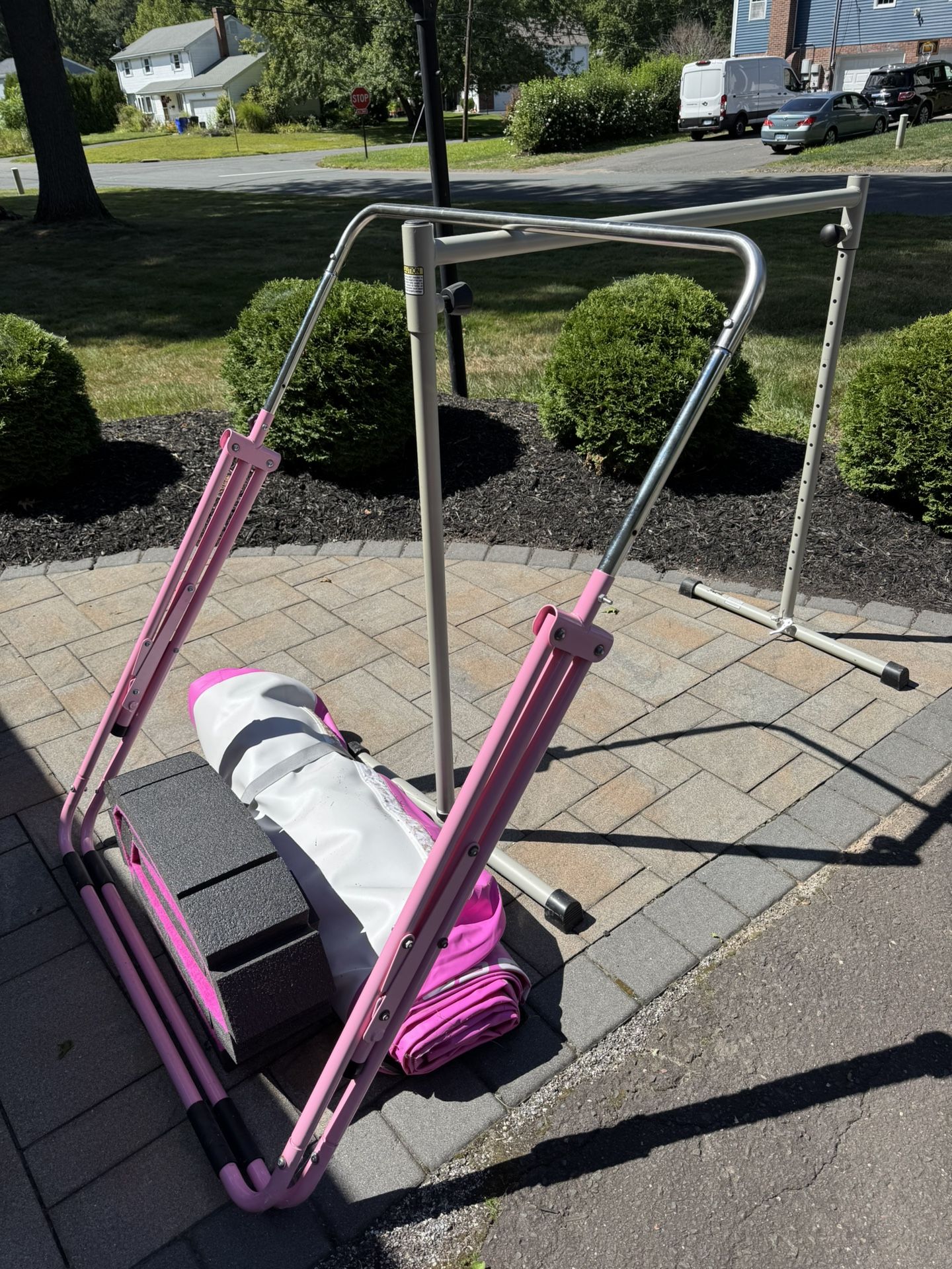 Great bundle of gymnastics equipment - kip bar, air tumble track, foam beam, stretch/dance bar.