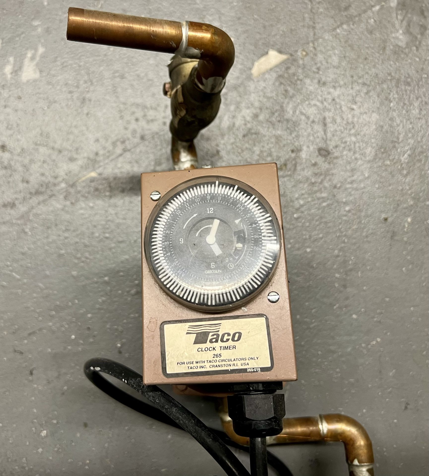 Taco 265-1 Analog Timer with Dust Cover Removed from a water heater that I replaced with a tankless water heater. In perfect working condition. Timers mount to the wiring of the circulating pump and provide programmable controls to adjust the time-of-day and duration that a circulating pump operates. The timer helps save energy by only running the pump during periods of demand on the system. They can be used in conjunction with an aquastat which starts and stops the pump to maintain a stable water temperature.