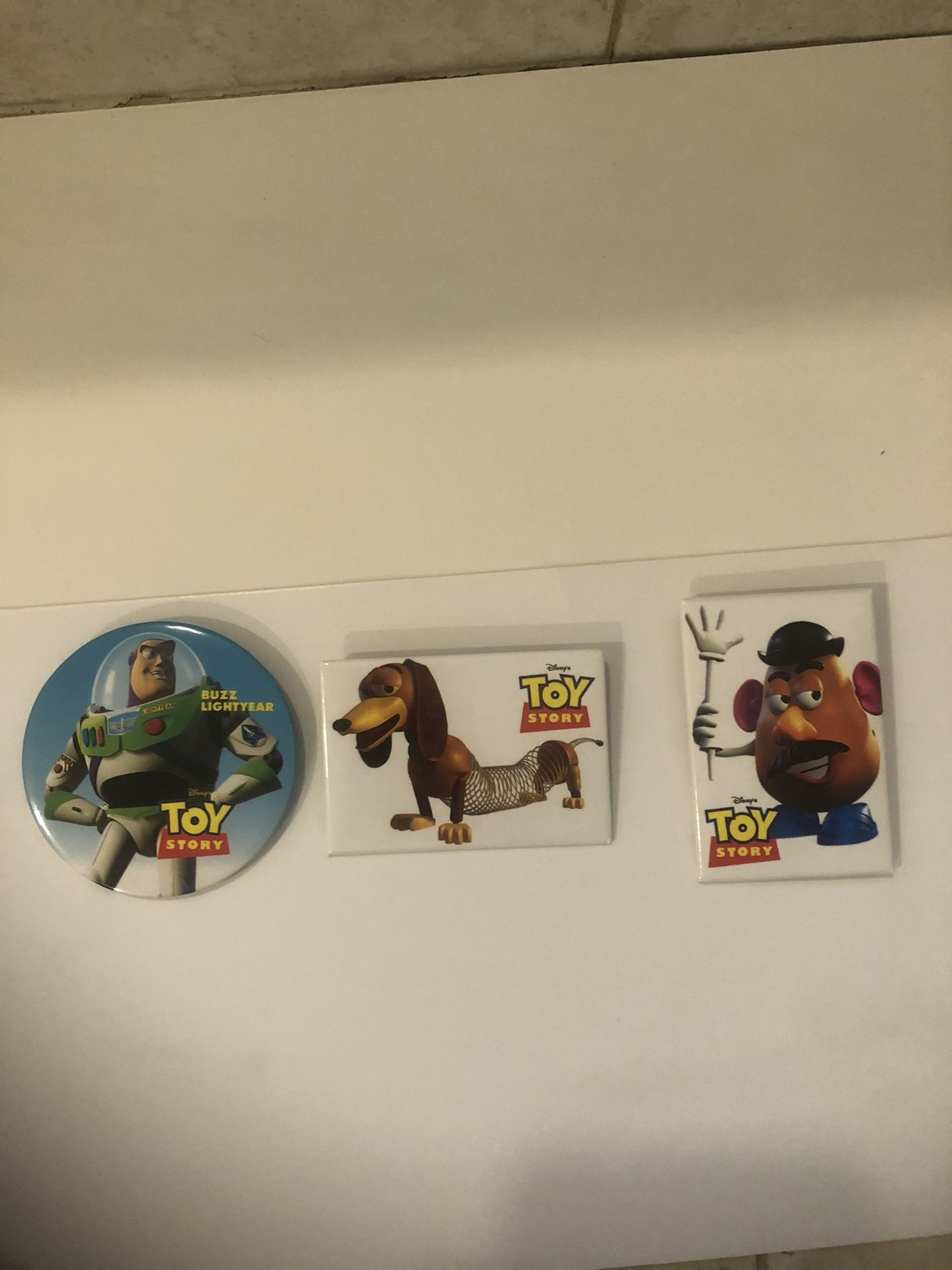 Three vintage collectible pins or buttons featuring characters from the Disney and Pixar movie Toy Story. The characters shown are Buzz Lightyear, Slinky Dog, and Mr. Potato Head. These are previously owned but were not displayed and carefully stored for years. I ship using recycled materials for the good of the environment.