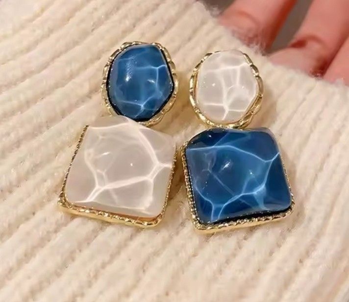 White, & Blue Square Oval Asymmetrical Drop Earrings