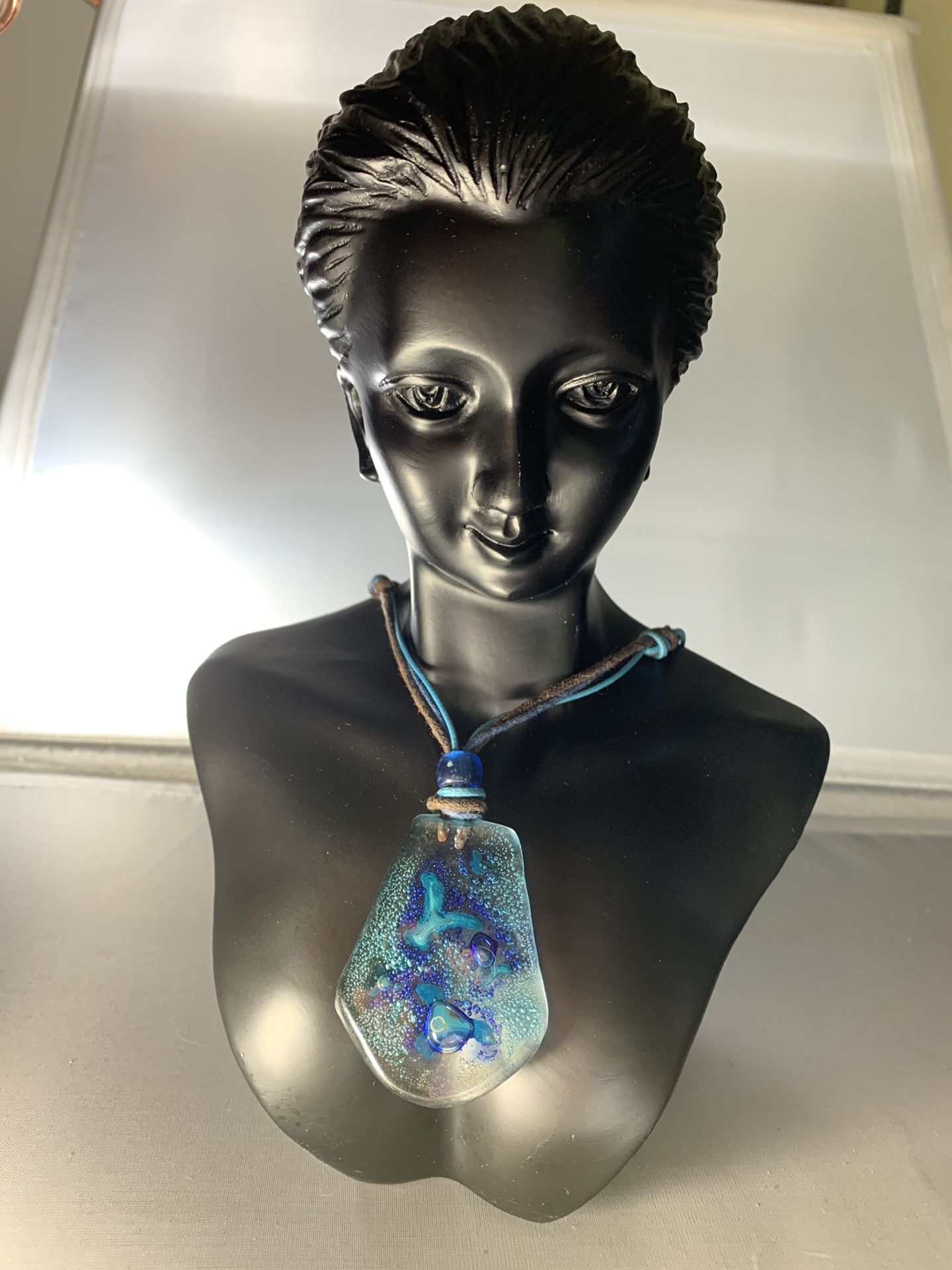This piece reminds me of the great beautiful blue ocean. It’s 2” pendant with cord strands. Unique necklace and the pendant is made of real glads so, super cold to the touch. Great for these hot summer days in the heat.