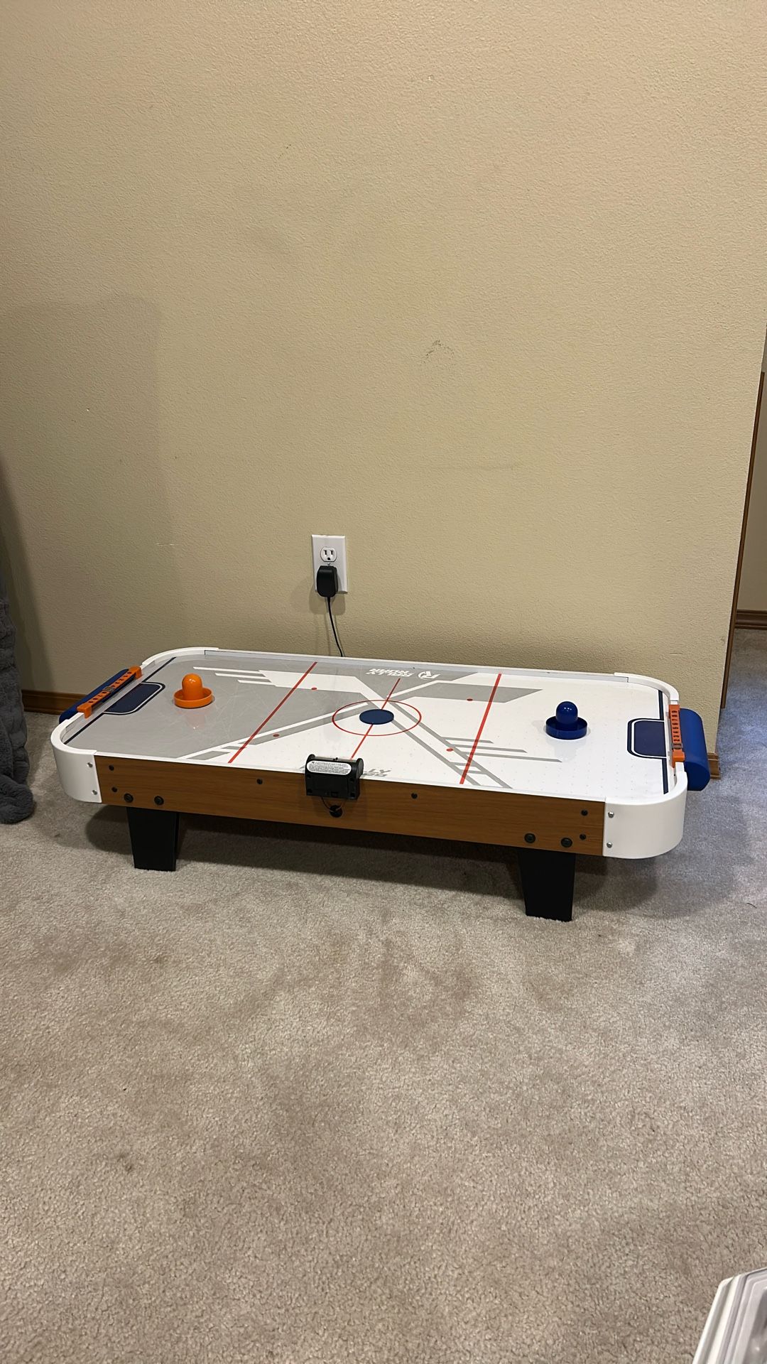 Item is like new, only used a few times. The sticker is still over the electronic score board from manufacturer. Originally purchased on Amazon for $95 Includes tabletop game, 2 pushers, 1 puck and AC-12V motor with plug, electronic scorer and old school slide scorer The compact design of the Rally and Roar 40-inch Table Top Air-Powered Hockey with LED Electronic Scorer is perfect for kids and adults. At 40” x 20” x 9” in dimensions, it is convenient enough to be tucked away in any space and turn any table space into a play area. Aside from UL Certified motor that plugs easily into any wall outlet, this air-powered hockey game boasts two types of scorers. One is an LED electronic scoring system that looks great and amplifies the fun every time you play. This electronic scorer requires 2 AAA batteries which are not included. The other is built-in slide scoring, for times when you want to keep it old school.. The legs are padded with foam to prevent scratches or wear and tear to your table top or floor.