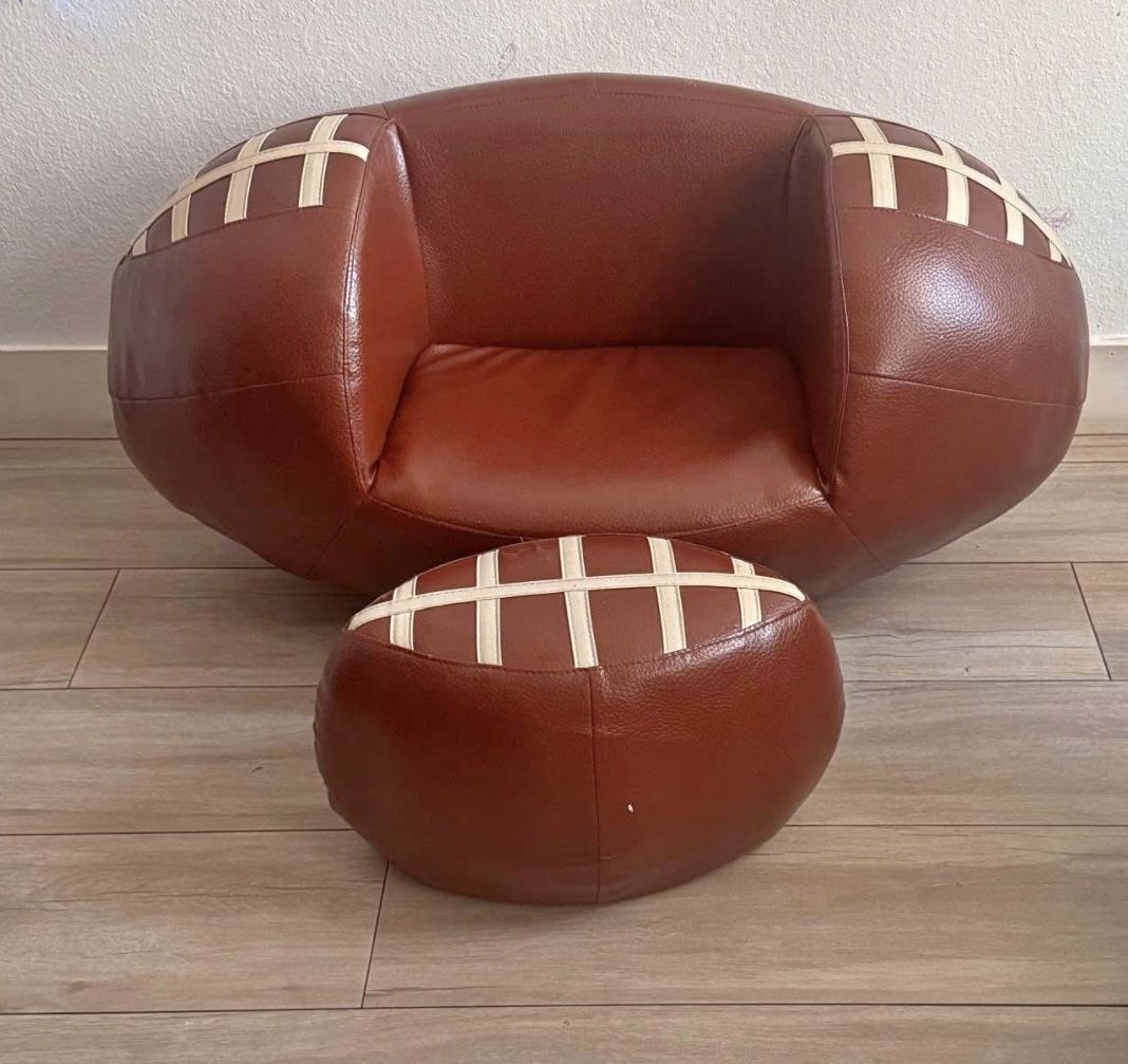 Retails $200 + tax selling for only $60 Sport Brown Vinyl Fabric Chair & Ottoman Our realistic sports ball chair and ottoman sets make the perfect place to watch the game. Sturdy wood frame construction is fully padded and covered in durable vinyl upholstery for easy cleanup, and features a swivel base. Overall (in.) 45.5"w"w x 28.5"d"d x 27"h"h
