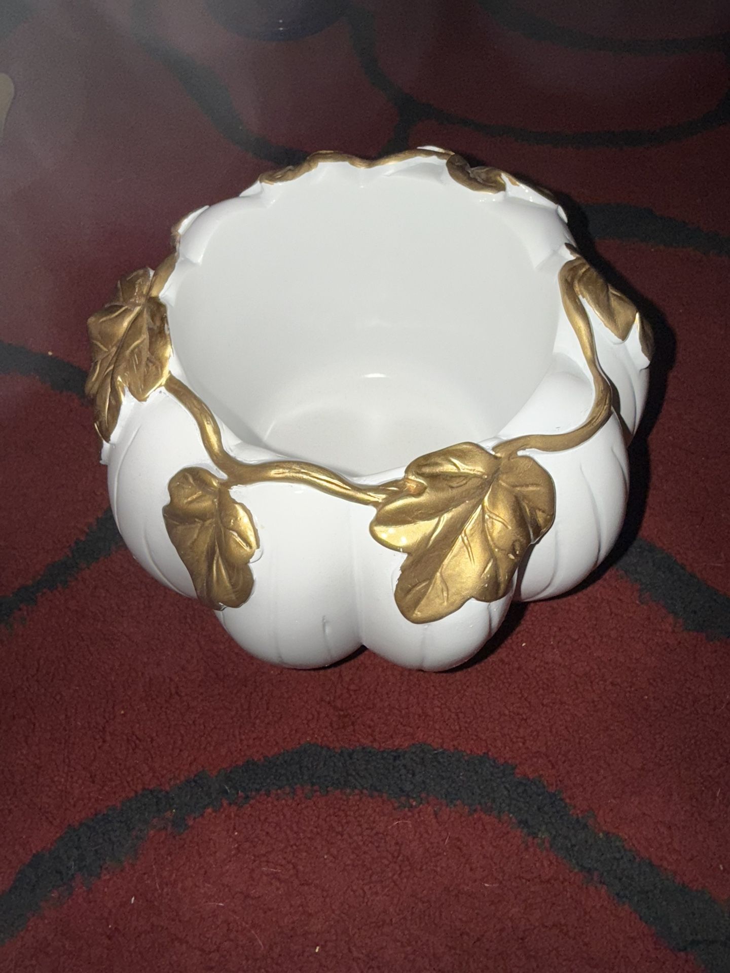 Brand new, from Yankee candle. Never used. Pair your favorite fragrance with the perfect pumpkin. Ideal for fall décor, this white pumpkin adorned with golden leaves can hold your candle for a cozy fall vibe. Made of polyresin. It's fun to prepare your home for every season, any celebration or just because. We love how candle holders make any setting special and how they complement our fragrances. Try a new candle holder and see what a big change a little touch can make! For use with our Original Large Jar Candles and Large Tumbler Candles. 7" L x 7" W x 4.75" H