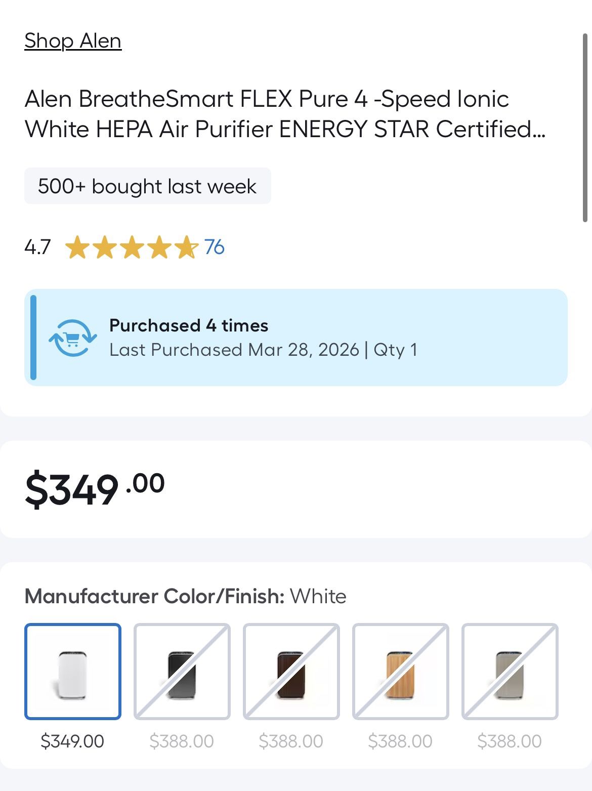 Alen BreatheSmart FLEX Pure 4 -Speed Ionic White HEPA Air Purifier ENERGY STAR Certified (Covers: 700-sq ft )