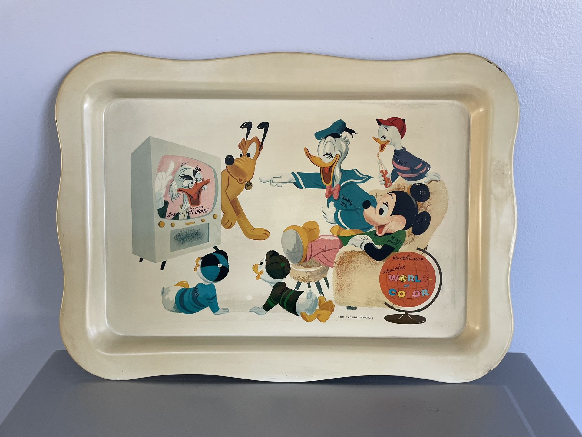 1961 Walt Disney's Wonderful World Of Color Metal TV Tray depicting Mickey, Pluto, Donald and nephews watching Ludwig on tv. Measures 17.5” x 12.5”. Tray has a few tiny paint chips along extreme edges (see pics) otherwise an excellent Disney collectors piece. $40, obo. Pick-up only in Whitestone Queens or Oceanside LI.