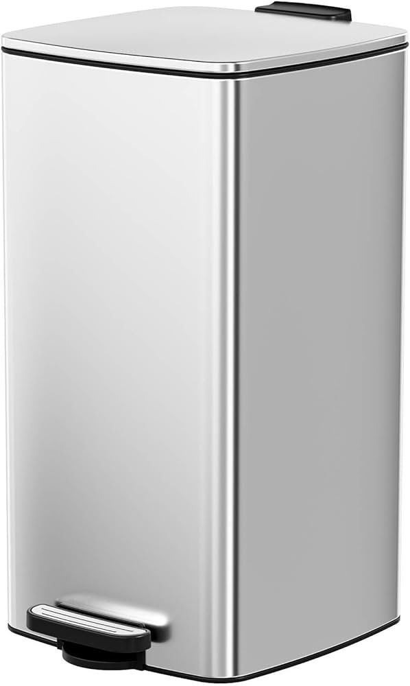 B802 $35 8 Gallon (30L) Square Trash Can, Stainless Steel Step Garbage Can with Soft-Close & Stay-Open Lid, Fingerprint Proof, Removable Inner Bucket for Kitchen, Office, Living Room Capacity 8 Gallons Color Silver Opening Mechanism Step-On Material Stainless Steel Recommended Uses For Product Kitchen Sleek Square Design: Modern square trash can fits perfectly into corners and tight spaces, maximizing your floor plan. It’s built with high-quality, brushed stainless steel that is fingerprint-proof, resisting smudges and stains for a lasting elegant look Hygienic Step & Quiet-Close Lid: Kitchen trash can features a wide pedal that offers true hands-free, hygienic operation to open the lid. It incorporates a built-in soft-close mechanism that ensures the lid closes back down gently and quietly every time, eliminating disruptive slamming noises Convenient Stay-Open Feature: Trash bin allows its lid to be easily set to stay open at a 90° angle for times when you need both hands free, making it perfect for quick disposal during meal prep, cleaning, or when the bin is in frequent use Removable Inner Bucket: Garbage can is easy to clean thanks to its removable inner bucket with handles, which securely holds standard 8-gallon bags, contains leaks, and helps lock in unpleasant odors to keep your space fresh Durable & Stable: Garbage bin is stable and thoughtfully designed. It features a non-slip base to stay firmly in place, a practical rear carrying handle for easy relocation, and a tidy, space-efficient profile suitable for any room ly-83