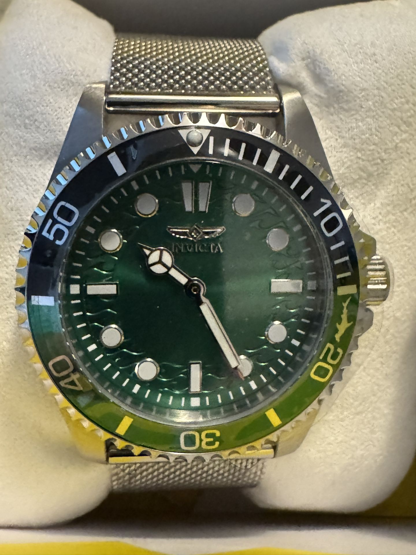 Invicta Pro Diver Men's Watch - 43mm Brand New in box Never Worn Dial Color Green Dial Material Metal Case Size 43 Case Tone Steel Case Material Steel Crown Type Push Luminous Color White Luminous Material Tritnite Lot # 20
