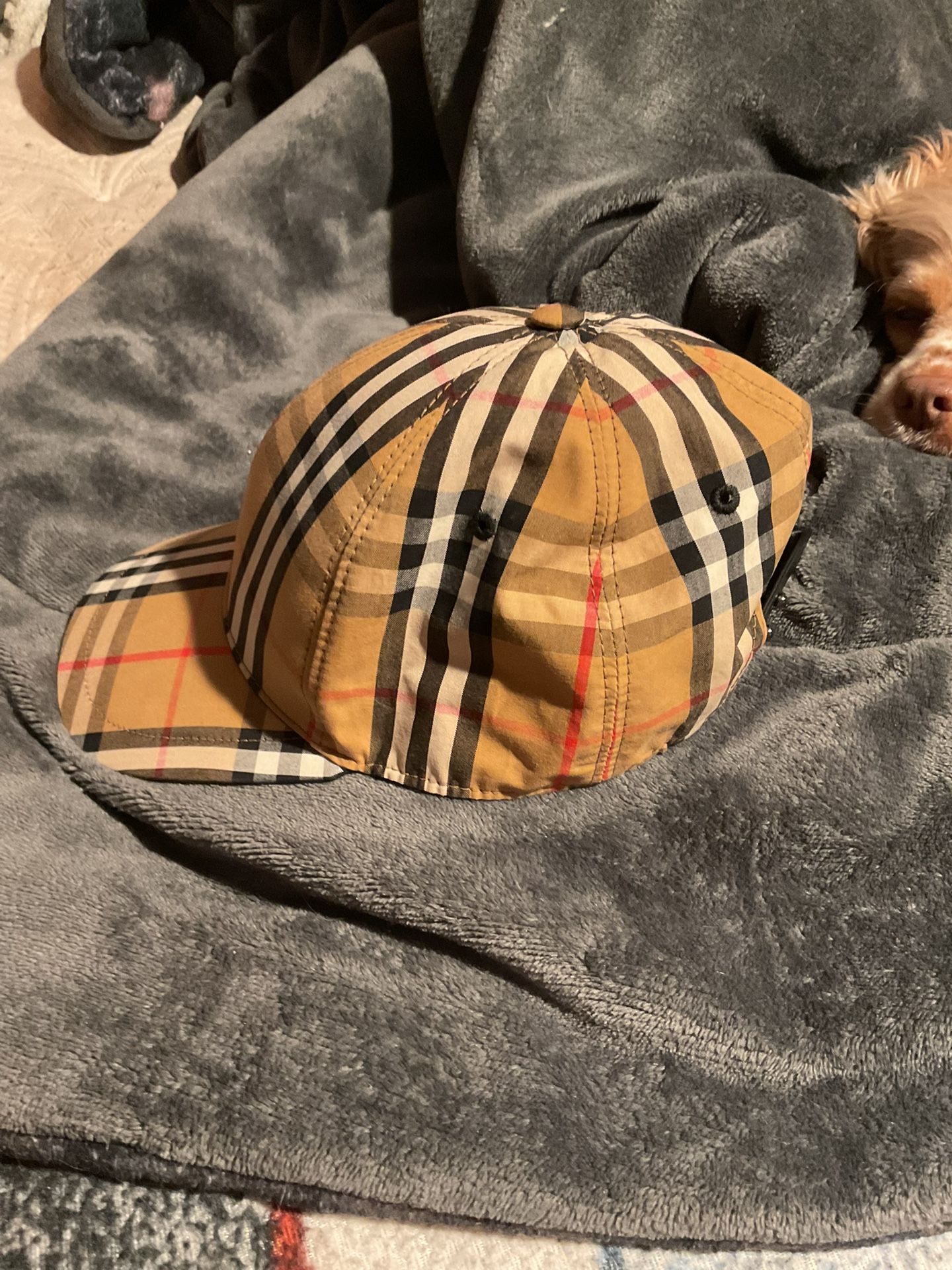 Burberry Vintage Check cotton gabardine baseball cap, a classic design featuring the brand's signature "Archive Beige" plaid pattern. These caps are considered a unisex style Burberry bag included Size: Medium Material: Crafted from 100% cotton gabardine, a durable and lightweight fabric invented by the brand's founder. Design: It features a six-panel construction, a curved brim, and an adjustable strap at the back, often with a "B" buckle closure. Pattern: The prominent "Vintage Check" pattern includes tan, black, white, and red lines. Origin: The caps are typically made in Italy.