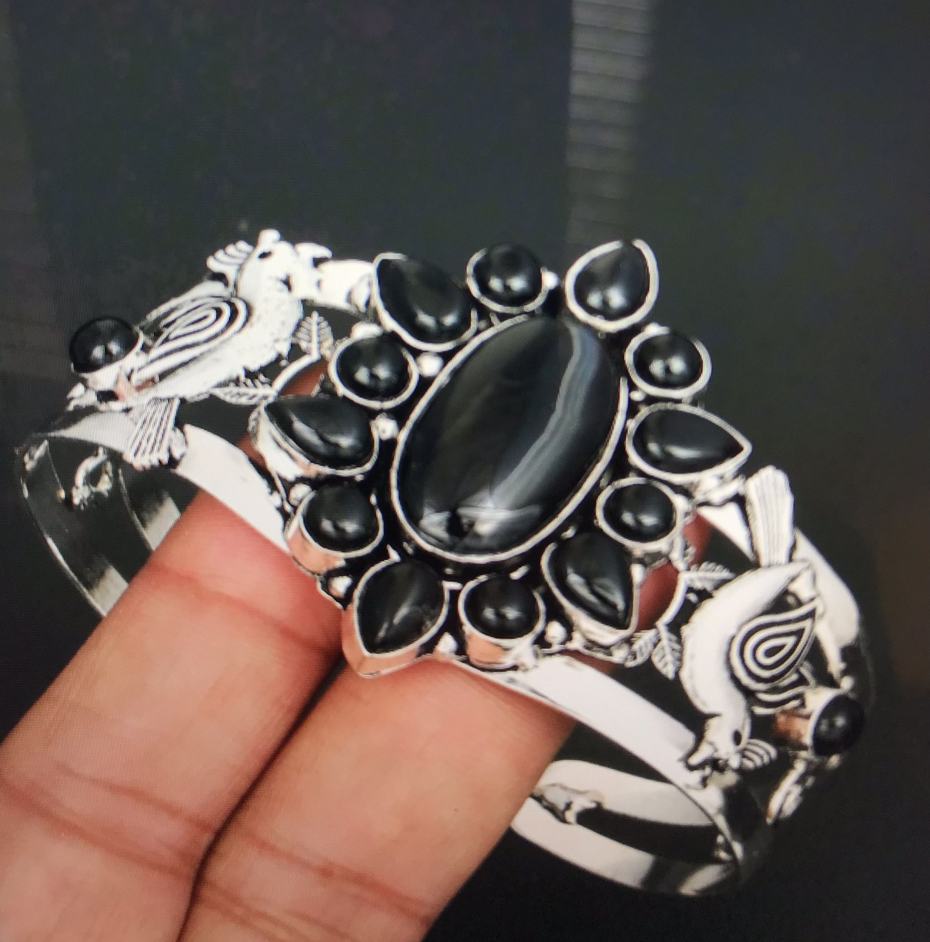Stunning 925 Sterling Silver Cuff Bracelet 6.5 Inches n Length 40 Carats of Botswana Agate Stones 22 Carats of Black Onyx Stones