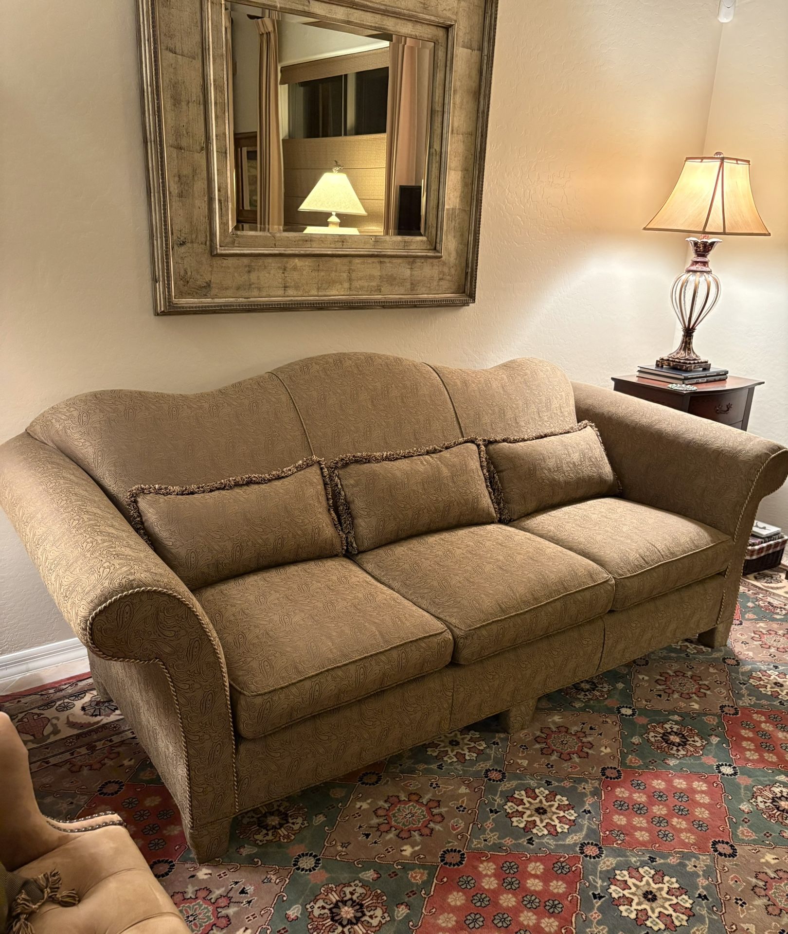 Paisley brown/gold fabric with custom trim. CLEAN, no pets, VERY comfortable. 90” long 42” deep 34” high