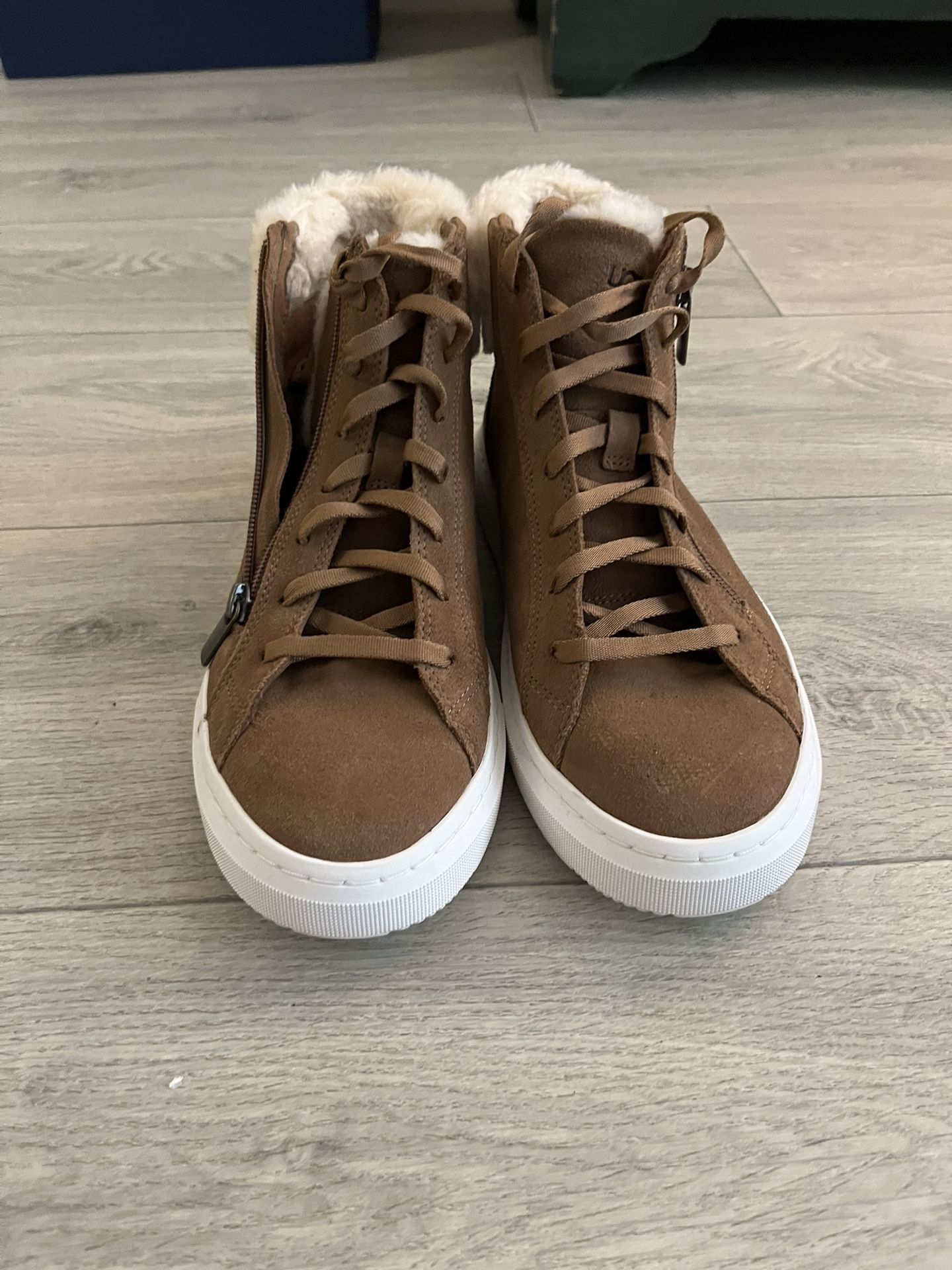 The item shown is a pair of UGG Alameda Mid Zip sneakers, a sneaker-boot hybrid crafted from rich suede. These high-top sneakers feature a cozy sheepskin-like UGGplush™ lining, a convenient side zipper for easy entry, and a durable rubber sole.