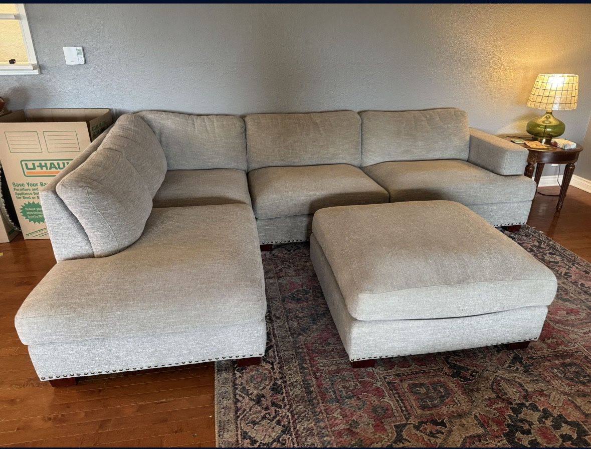 Comfy sectional sofa set. Has a chaise lounge perfect for relaxing. Comes with a matching ottoman. Light neutral color fabric with a nice texture. Features cool nailhead trim along the bottom. -Free Delivery and installation available!