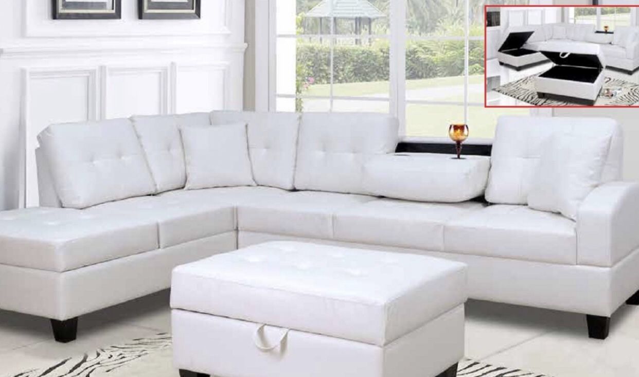 New white gel leather tufted back and seats with storage chaise and cup holders (ottoman not avail) We finance $54 initial payment Visit us at 5513 8th Street W Suite 10 Lehigh Same day delivery available Limited quantity available Hablamos español