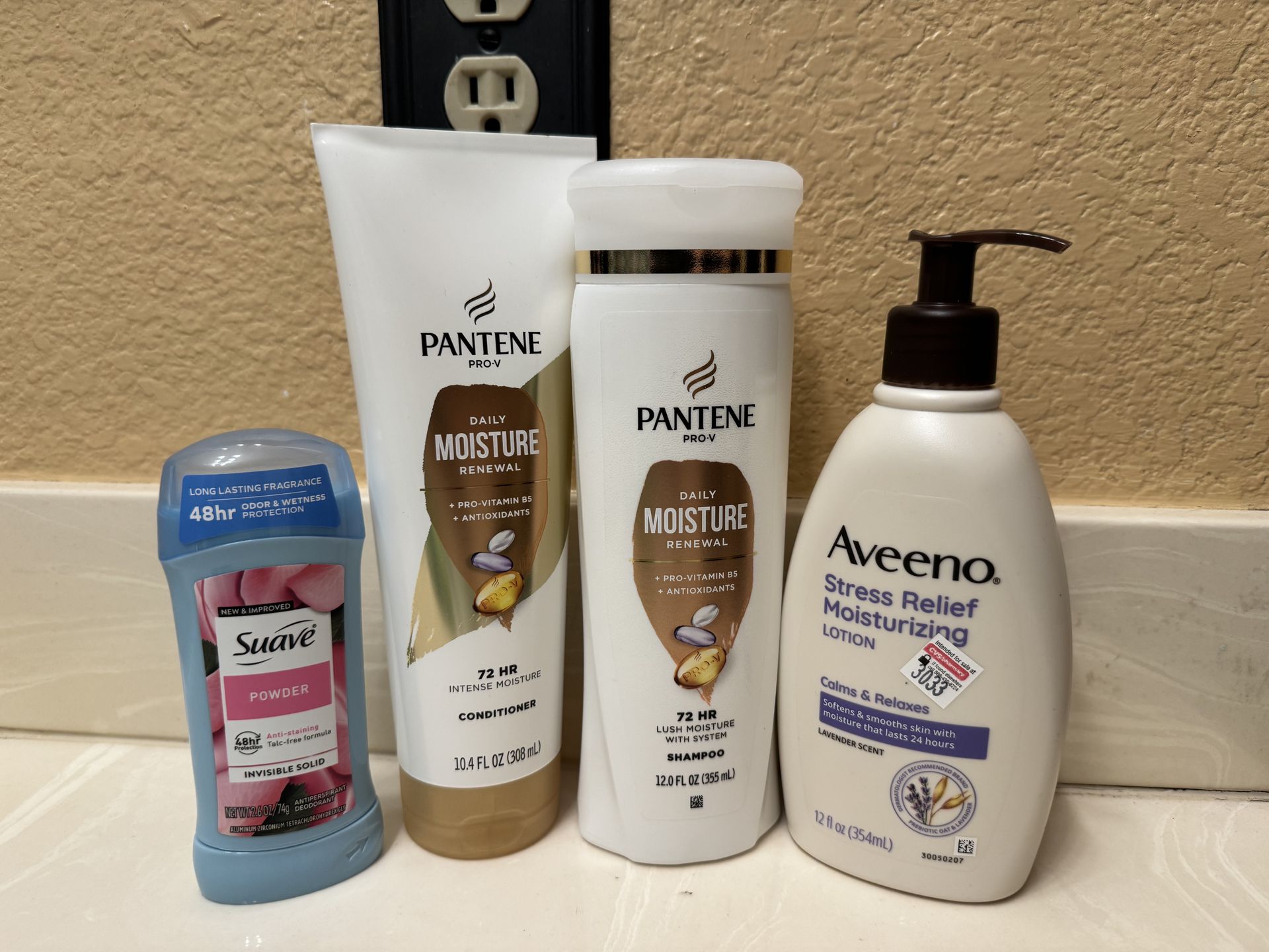 1 Pantene shampoo 1 Pantene conditioner 1 Suave deodorant 1 Aveeno lotion ( Toal retails for $27 )