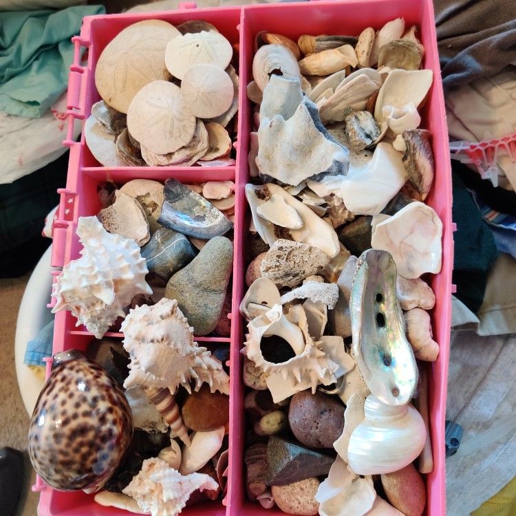 This is a box of misc shells, sand dollars and rocks. Some exotic most common. $5 selling as a whole I'm not digging into it
