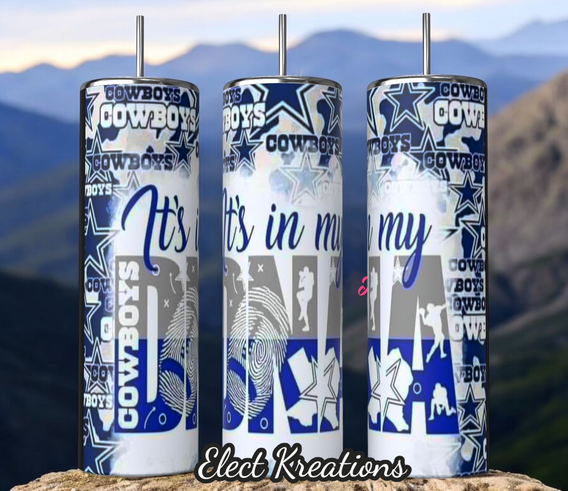 Show your Cowboys pride with this sleek, 20oz stainless steel skinny tumbler featuring the "It's in my DNA" design. Highlights: Double-wall vacuum insulation keeps drinks hot or cold for hours. Vibrant, full-wrap Cowboys graphic in team colors. Includes a secure lid and straw. Fits most standard cup holders. Hand wash only to preserve the design. Message to order . We do local meet ups and shipping if needed . Thank you for your preference!!