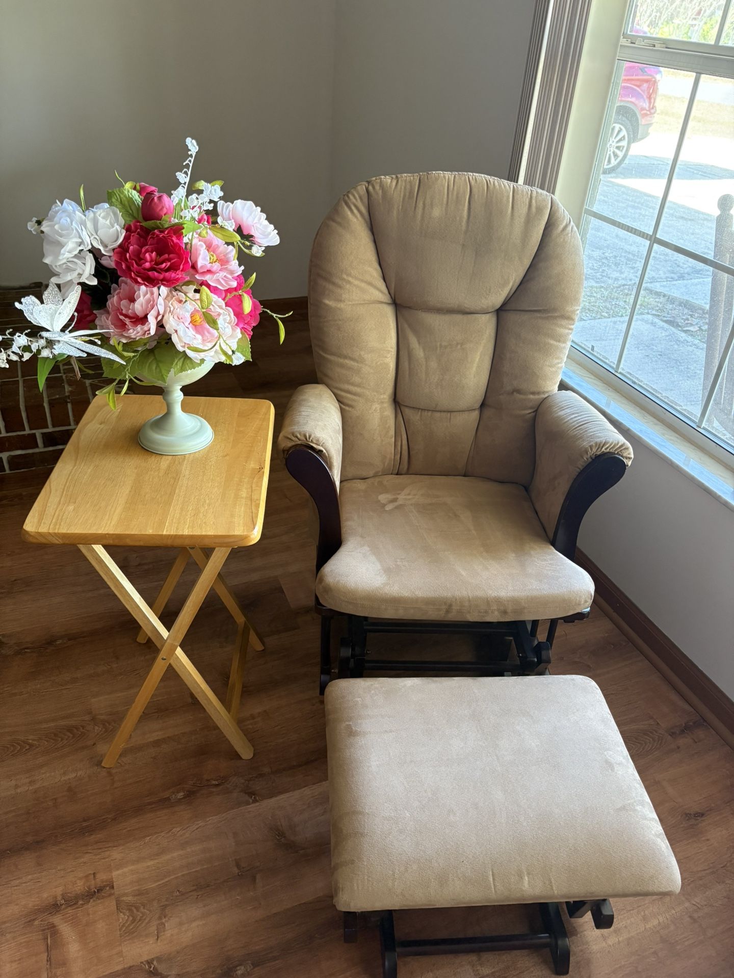 Brown slider chair with ottoman, lightly used in good condition. Chair seat is 20x18 inches.