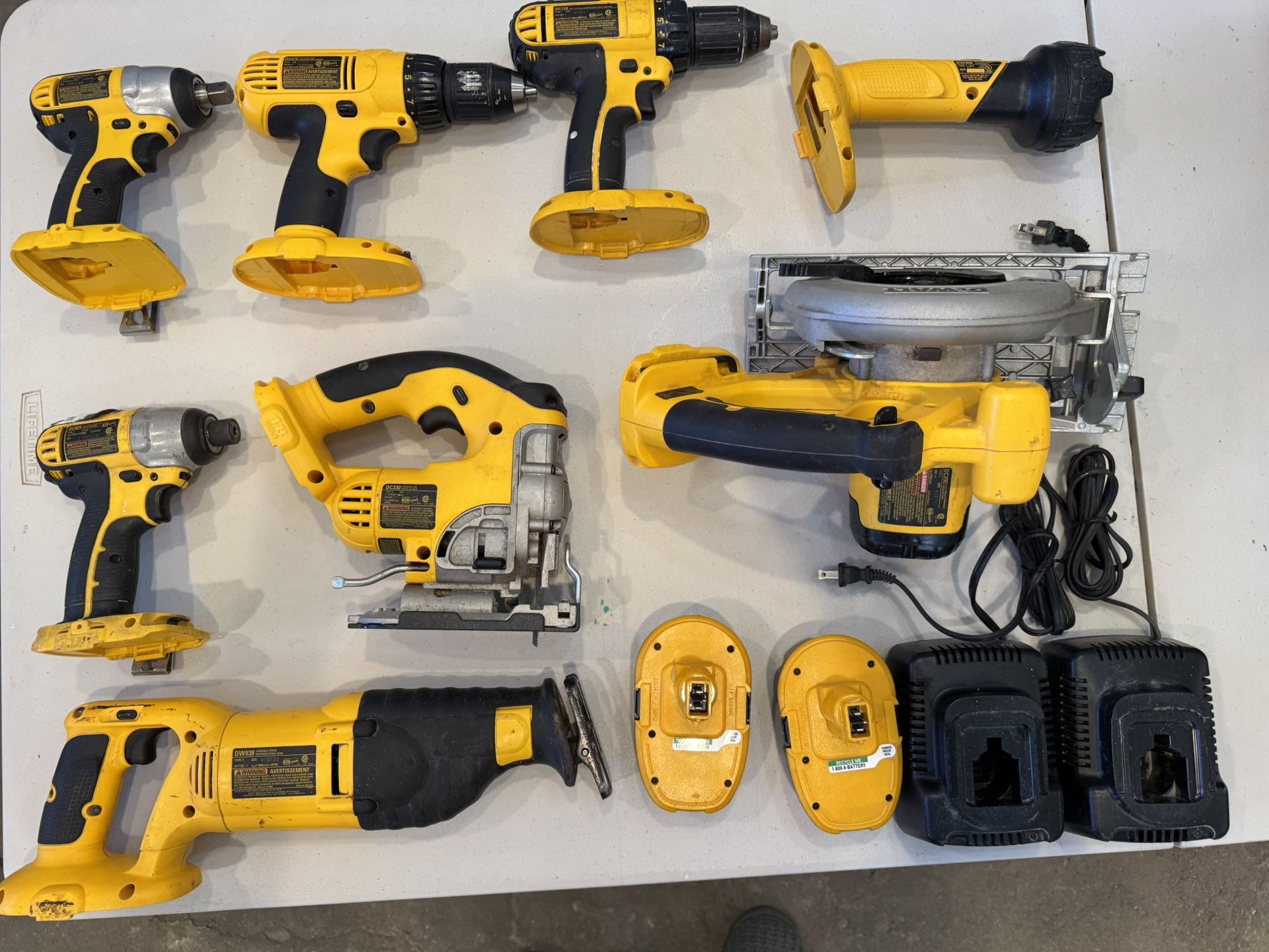 Lot of dewalt power tools. All the tools work 8 tools 2 chargers 5 batteries. (2 good, 3 not holding charge charge) One rolling tool box.