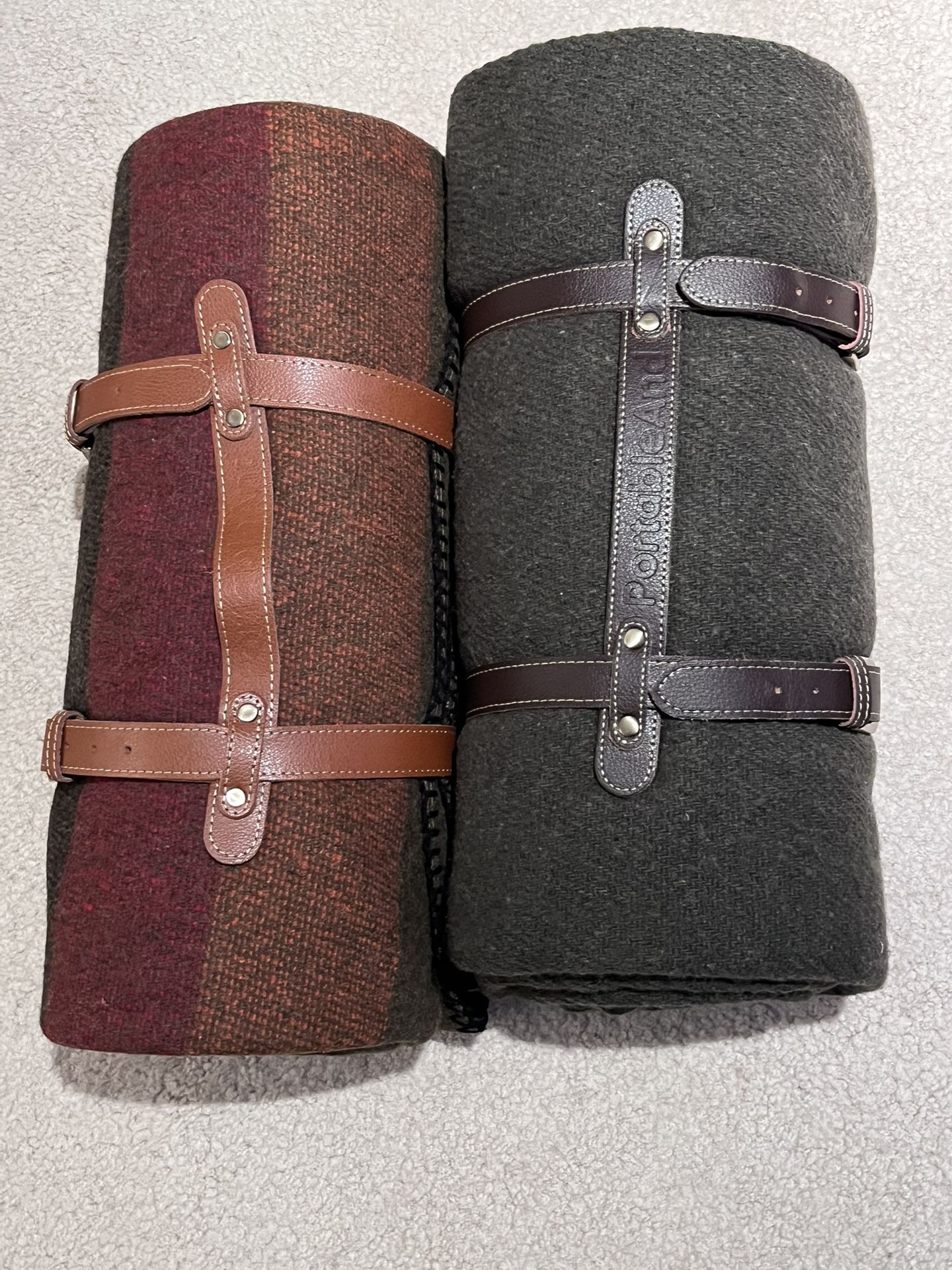 100% wool blanket with carry strap. 66x90 size. Brand new. No defects. No tears. No stains. Sold together or $40 each. Starps make them portable for camping and outdoor use. One is olive green and other is green with orange bands
