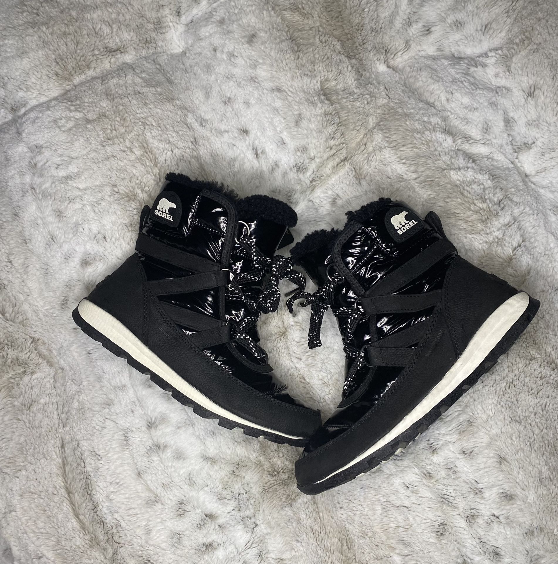 New with tags no box. Size women’s 6 Super lightweight. With a sporty, glossy design that can be worn anywhere and a warm-yet-breathable construction, these Sorel boots are another knockout pair for chilly temps from the brand that does the best in winter boots. Fabric: Faux patent leather Rubber sole Sherpa trim , Waterproof, Removable inslole Lace-up closure Lined insulation will keep your feet warm with a temperature rating down to -25°F/-32°C