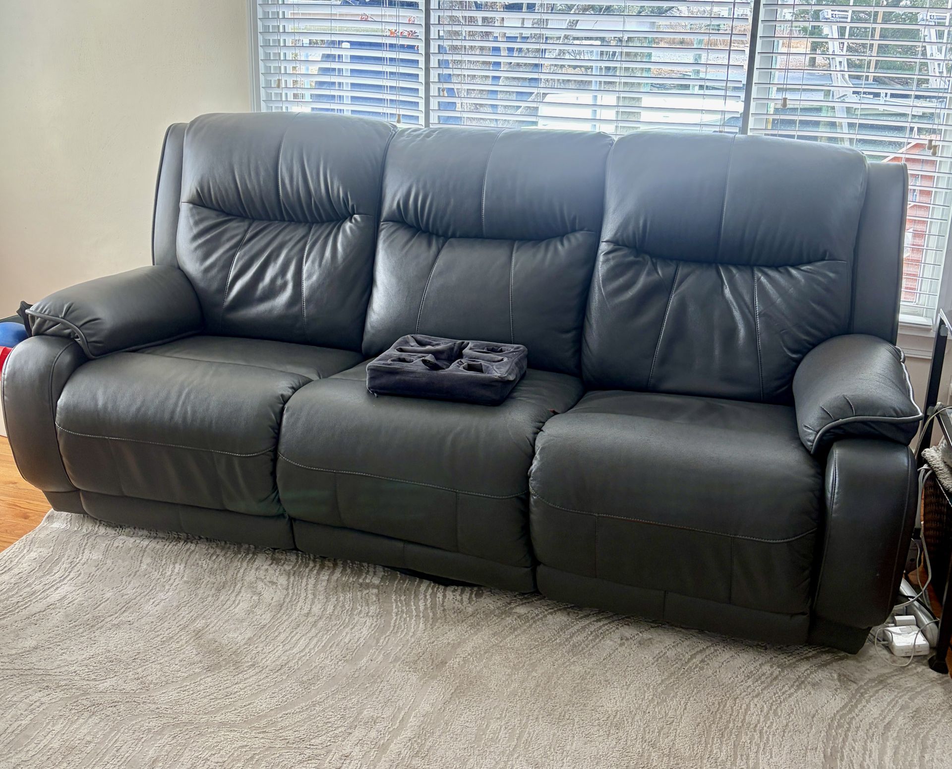 southern motion power recliner triple sofa with two reclining sections, center non-reclining section. adjustable power headrest, power foot recliner, power controls on either end with usb plug on each side 87” L 40” depth closed 65” depth when reclined (front to back) visible wear in one area, see picture