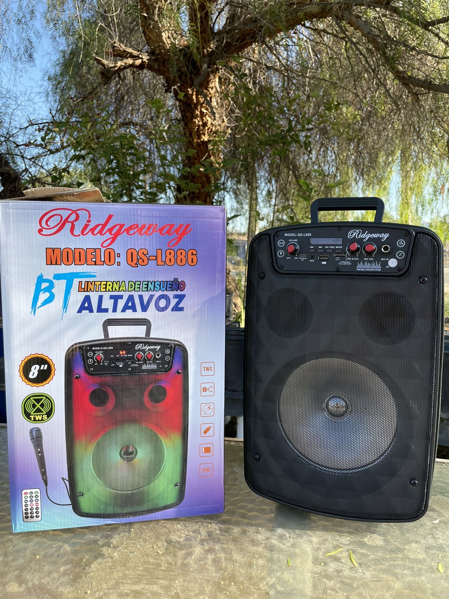 Brand NEW in box 8” Portable Speaker 25W Playtime: 2 HRS Bluetooth Micro SD AUX USB Memory card Colorful Light UP speaker Karaoke ready Includes Speaker Manual Charging cable Remote control Wired microphone