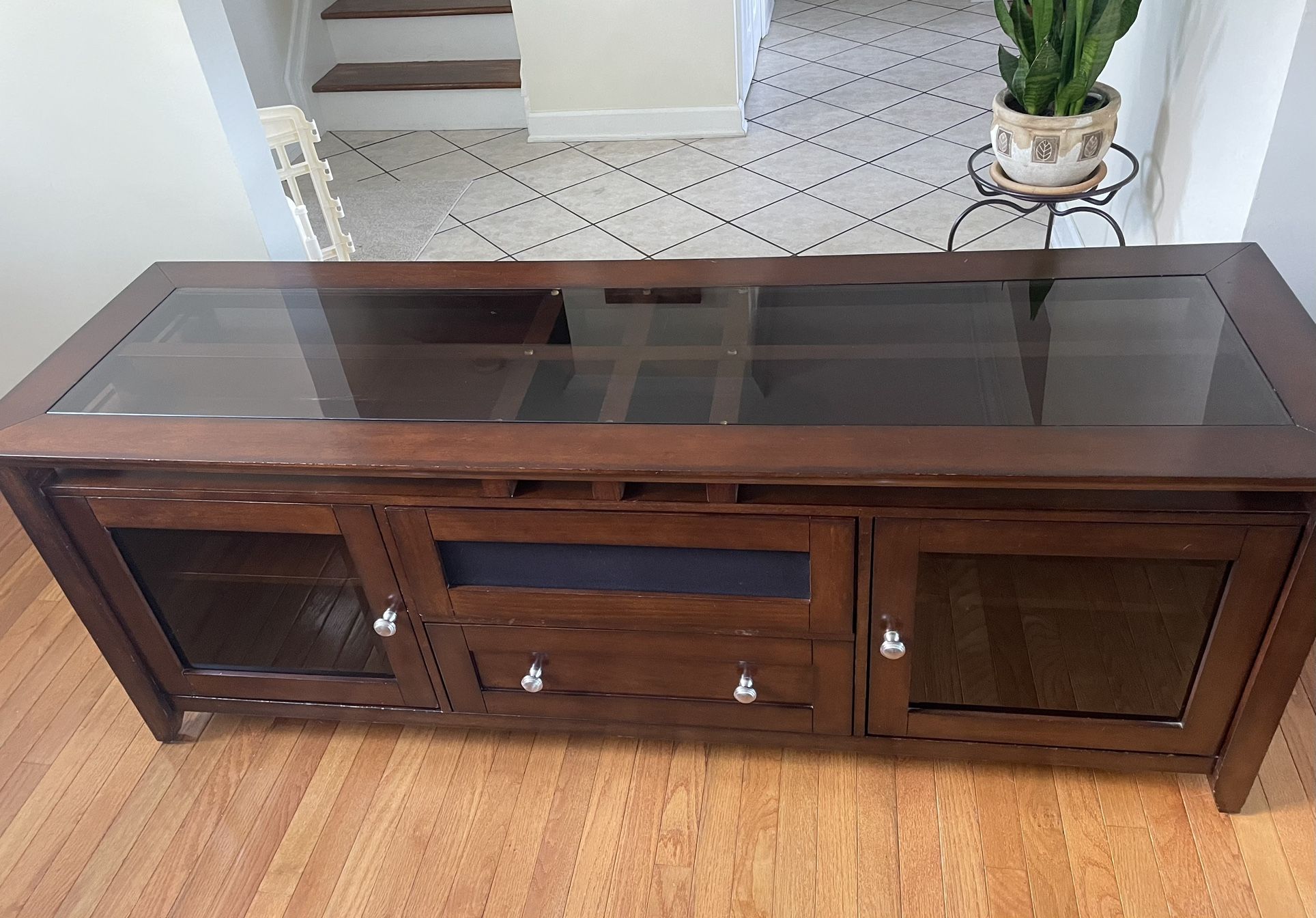 Great condition. Solid piece of furniture, heavy and well built. Paid over $1500 for it. Tempered glass on top and on doors. H - 25” D - 20.5” L - 68” $110