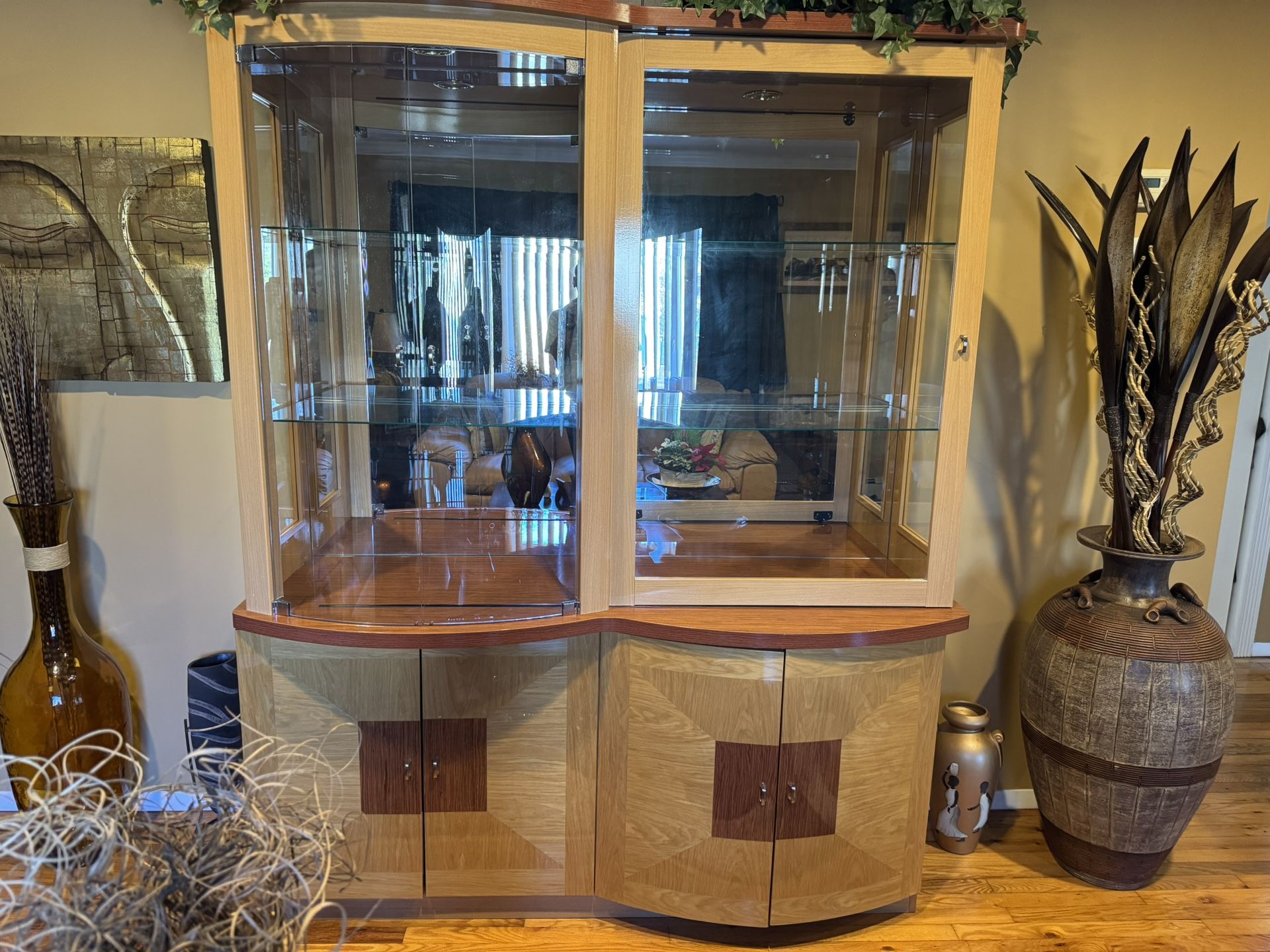 Brown and beige lacquer hutch with overhead lights. The top portion has 3 glass shelves with mirror background and overhead lights with sliding door and cabinet opening. The bottom portion has 2 cabinet’s slight damage in 1 cabinet. The piece is very sturdy and in mint condition well taken care of - no kids and no scratches on unit. The matching dining room table is also for sale in separate post. Buyer responsible for moving item. Dimensions height 83 inches width 69 inches depth of cabinets 19 inches. Unit is good for first time homeowner or apartment.