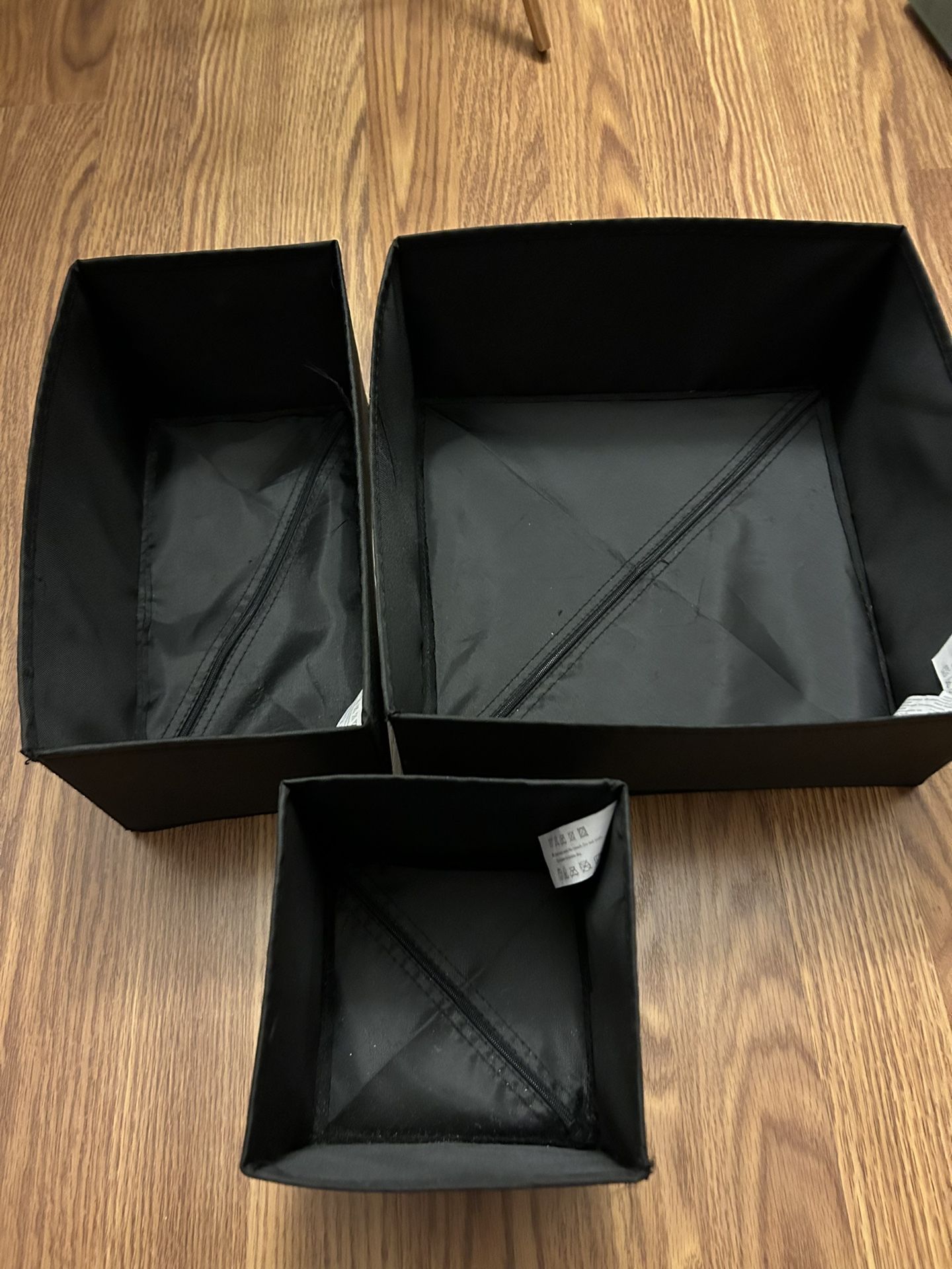 This set consists of 3 dresser drawer organizers. They come in different sized storage bins to match all sizes of drawers. They are used to organize your items so that the items have their own separate space to make life neater. Great for organizing underwear, bras, socks, etc. They are foldable, durable, collapsible, lightweight, and multiuse. Each has zipper at the bottom and a label holder to write the item’s name. The biggest square one is 11” x 11” x 5” The small square is 5.5” x 5.5” x 5” The rectangle one is 11” x 5.5” x 5” Great condition. Pet and smoke free home.