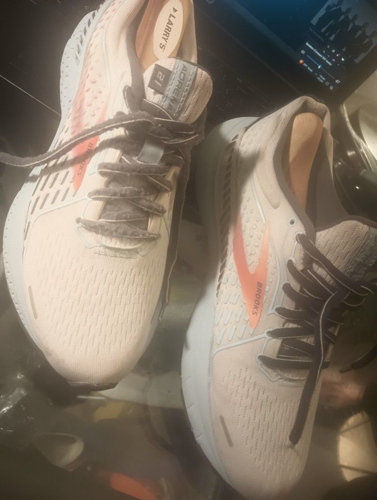 The Brooks Women's Adrenaline GTS 21 Running Shoes are a running shoe that are designed to be stable and supportive. They have a 12 mm heel-to-toe drop, a padded heel counter, and a gusseted tongue for a secure fit. They also have a full ground contact outsole and overlays around the midfoot for a stable and guided ride. Here are some insights from expert and user reviews: Pros Extended DNA Loft cushioning Medium to high arch support Patented Guide Rails for ankle and heel support Durable midsole Firm yet responsive ride Shoes are in Excellent condition with the exception of discoloration on sides of both shoes. Factored into price already. Great condition otherwise.