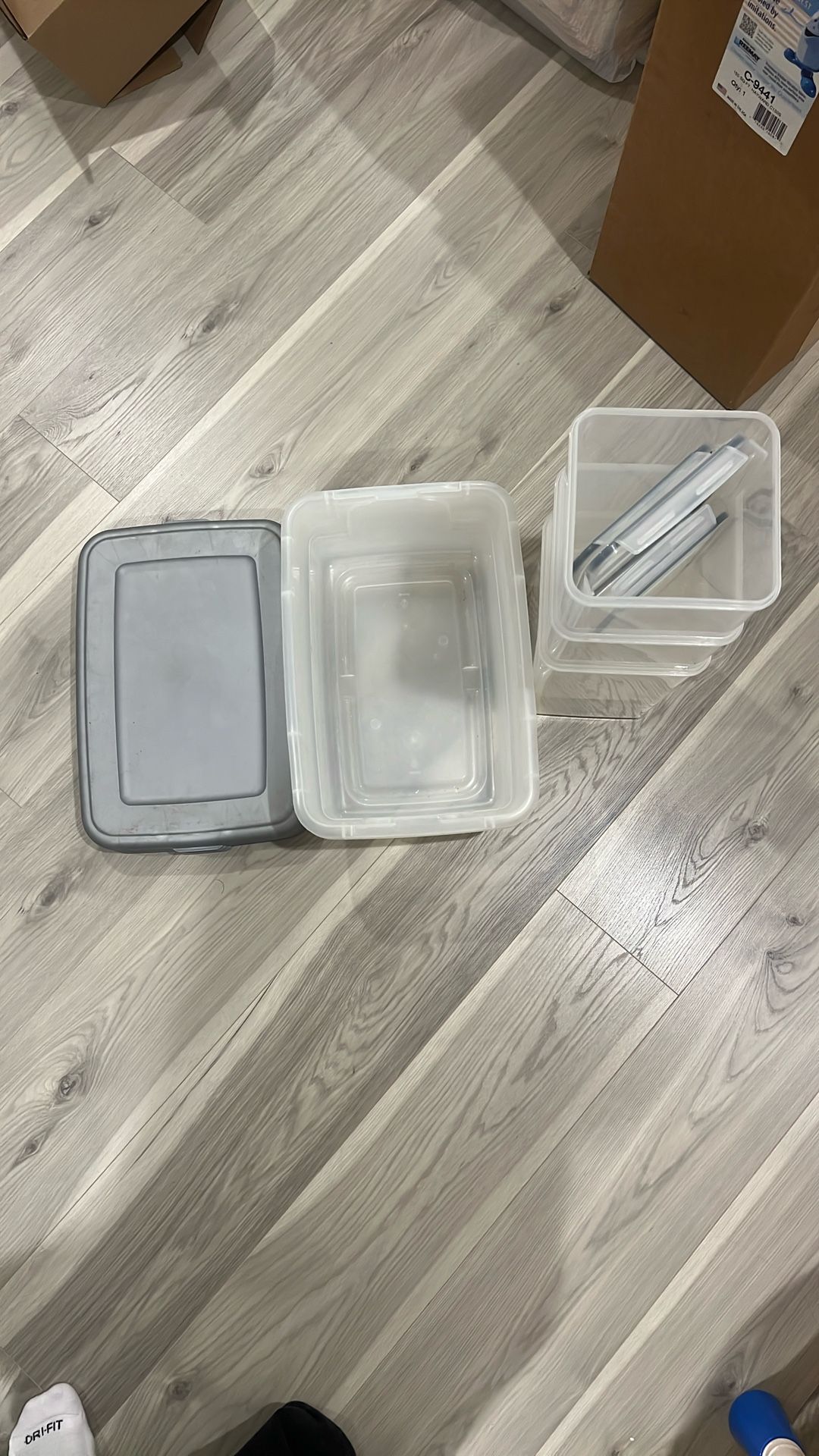 3 rectangular and 3 taller containers. Best offer length 16” x wide 11” x height 5 1/2”