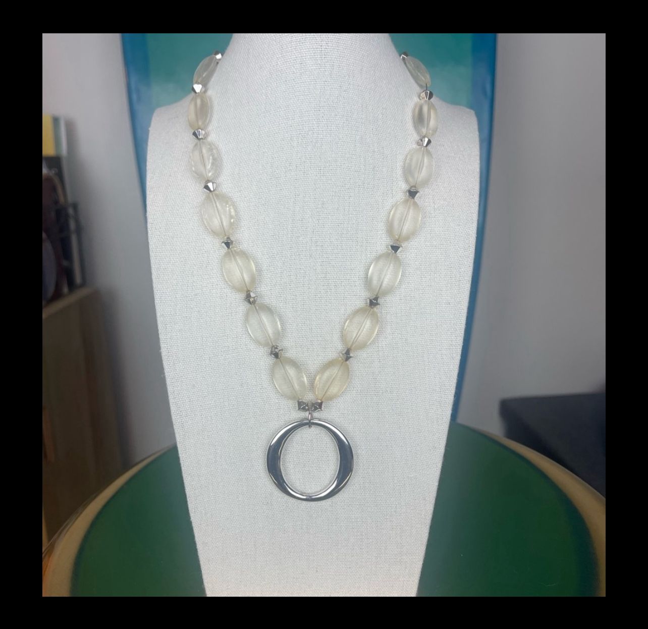 Neutral β’ Lightweight β’ Retro Modern A unique NY (New York & Company) frosted lucite necklace featuring translucent oval beads, faceted metallic spacers, and a bold double-ring pendant. Soft neutrals make this an easy match for any outfit. π Details Brand: NY Length: ~29β with extender Material: Frosted lucite beads + metallic spacers Pendant: Dual silver rings Closure: Lobster clasp + extender π Condition Frosted beads show visible internal wear / surface scratches (common with this style). Metallic spacer beads show light dulling. Hardware shows minor wear, still fully functional. πΈ Still photographs beautifully and has a cool vintage vibe. π° Original Retail Similar NY statement necklaces retail $26β$34. πΈ My Asking Price $10 π€©ππ»