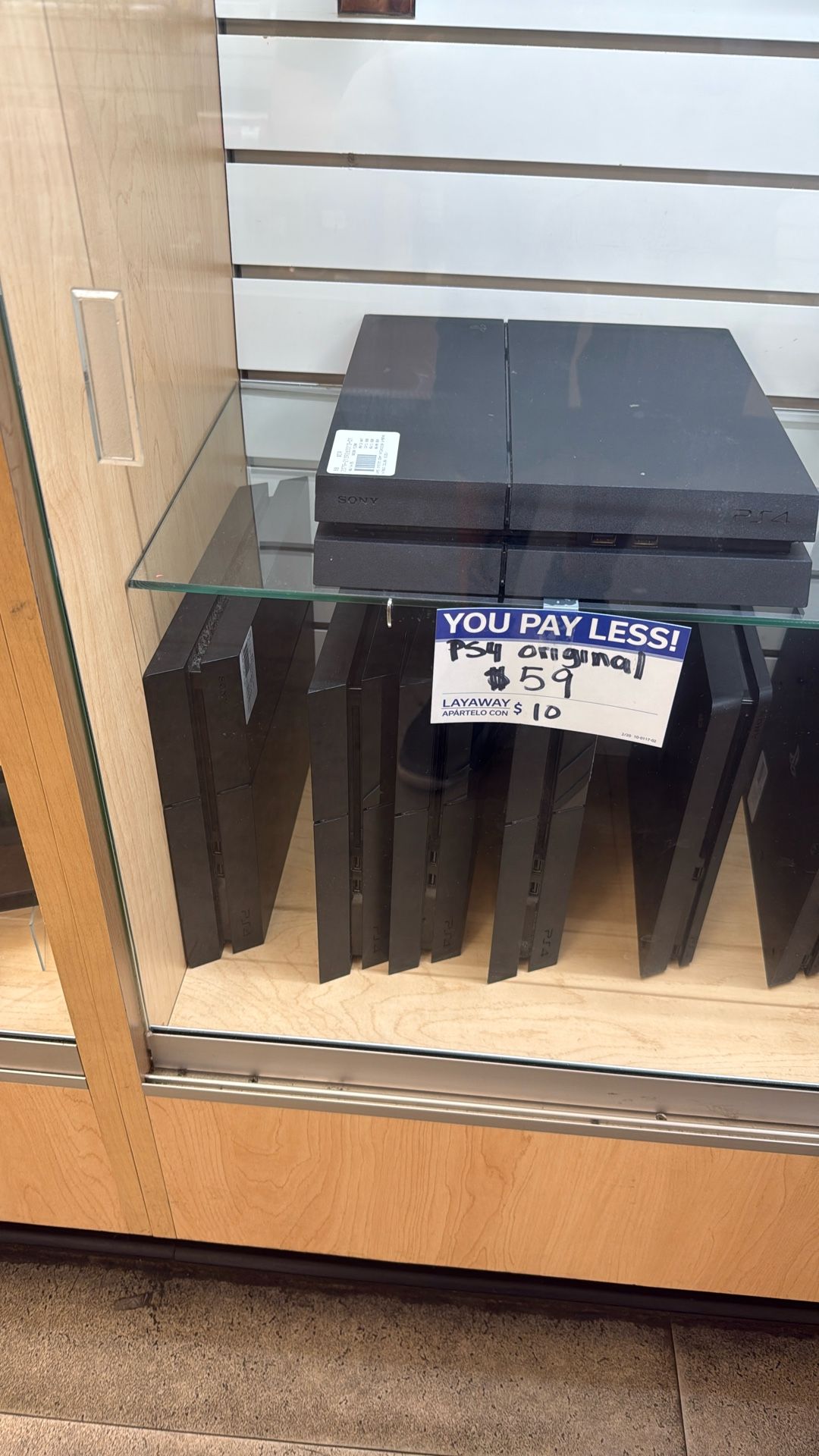 PlayStation 4 1st Gen for sale $59 plus Tax comes with one remote and the power cord and HDMI layaway is available also PS4 Slim version for sale $79 plus tax and the pro model $99 plus tax all systems comes with 1 remote controller and the cords any questions please send us a message