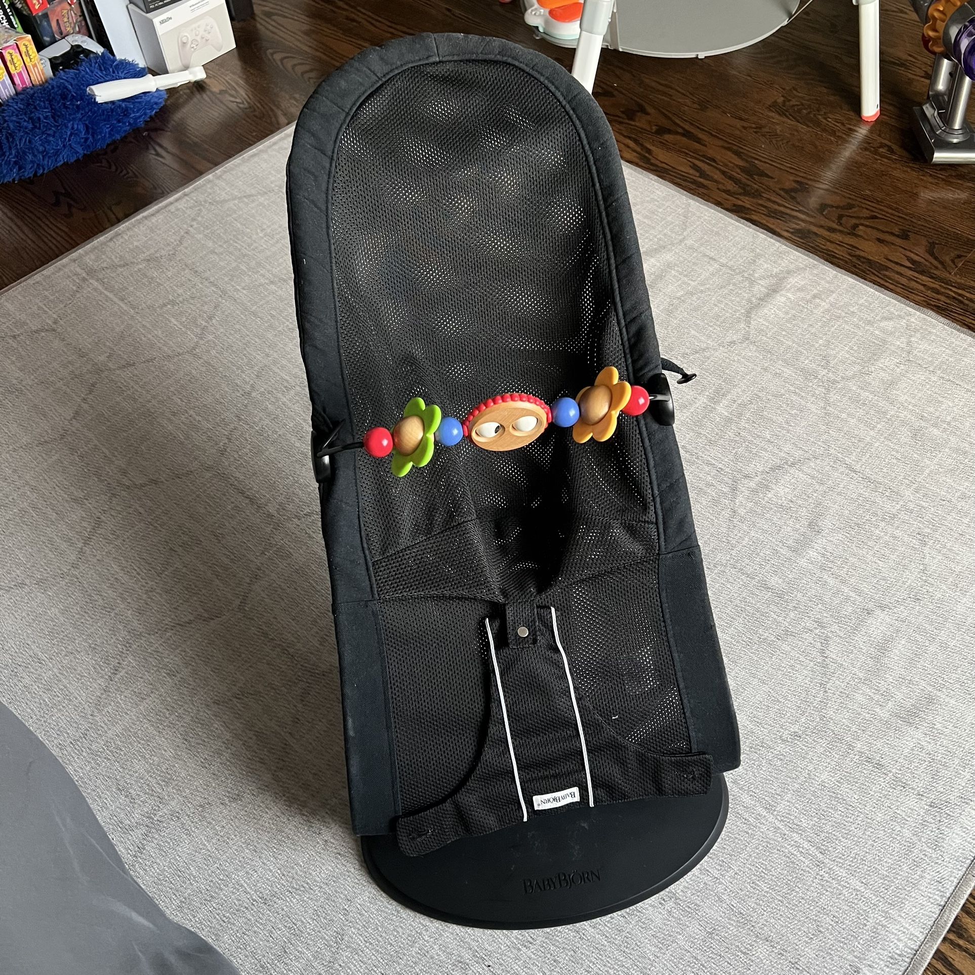 BabyBjörn Bouncer Bliss, Black Frame, Mesh, Black 2-in-1 Adjustable Baby Bouncer Seat, Newborn to Toddler (8-29 lbs), 4 Positions, Lightweight & Portable. Great, used condition. See pics for condition. Color: Black Comes from non-smoking and pet free home.