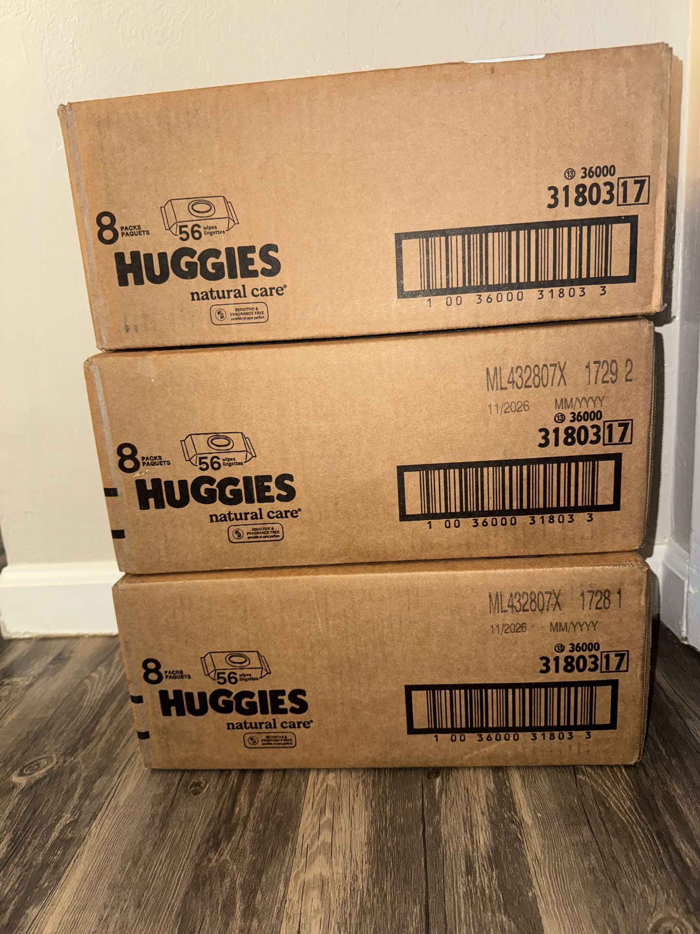 Brand new unopened cases of Huggies Natural Care wipes. • 56 wipes per pack • 24 packs total $60 for all or $20 per case. Pickup in Sacramento.