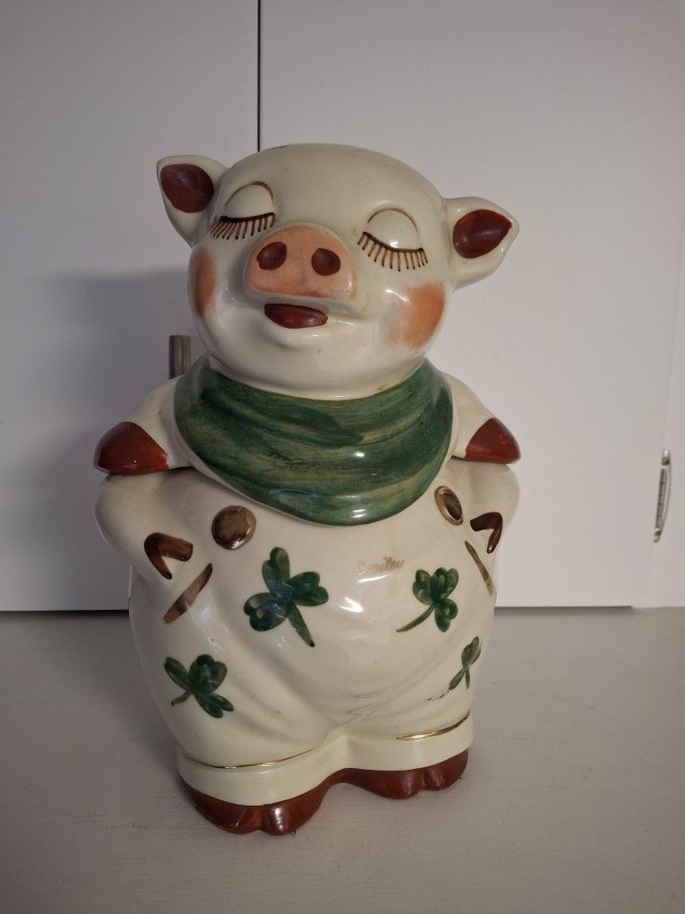 1940's Shawnee Pottery usa Smiley Pig This Cookie Jar is in beautiful condition no chips or cracks hand painted still has high gloss Finnish these are valued at $200 plus