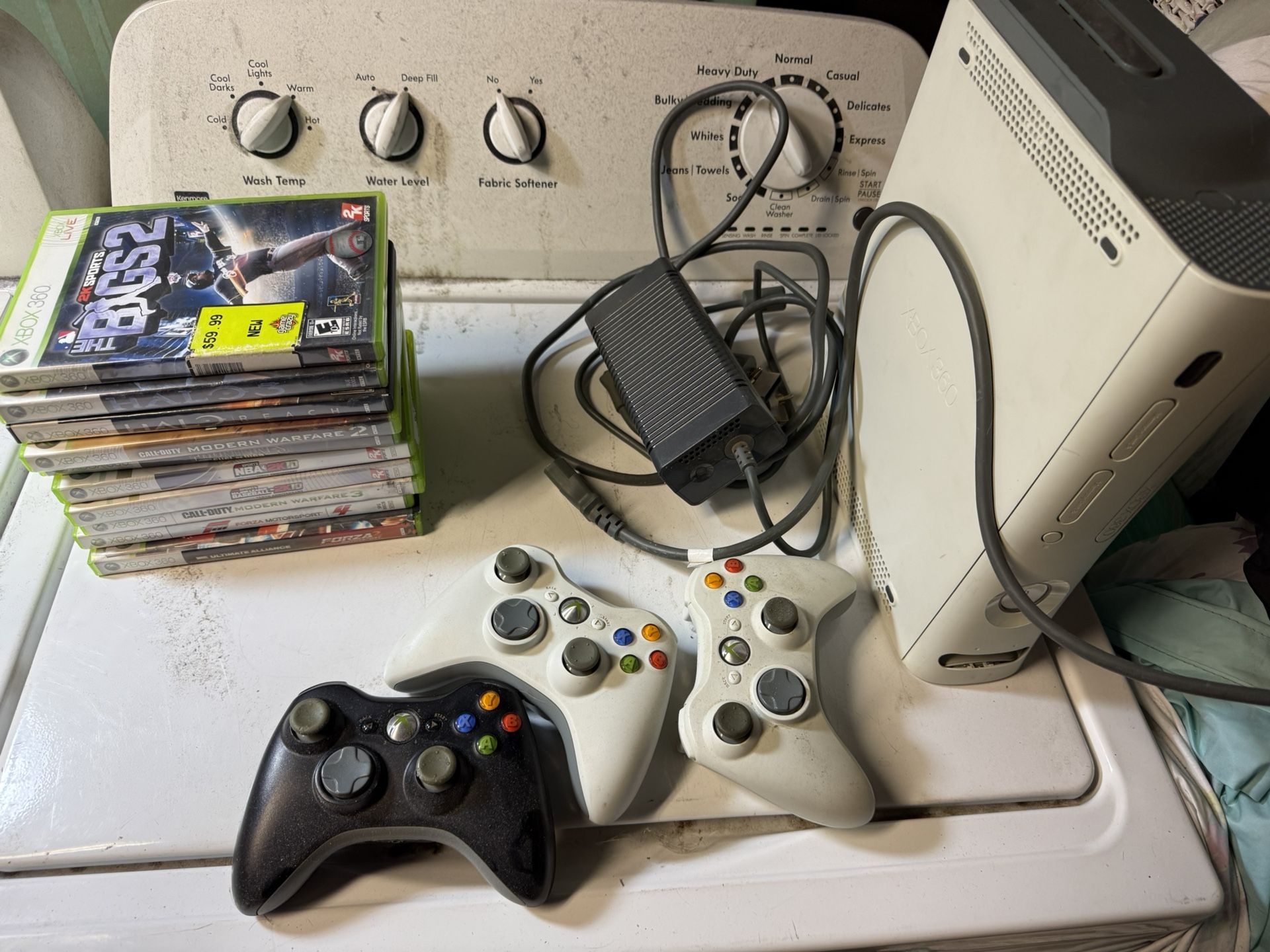Game console, three controllers, 10 -11 games. Turns on and works just can’t get the disk tray to open. Looking to trade for Nintendo switch, or switch games. Let me know what you got.