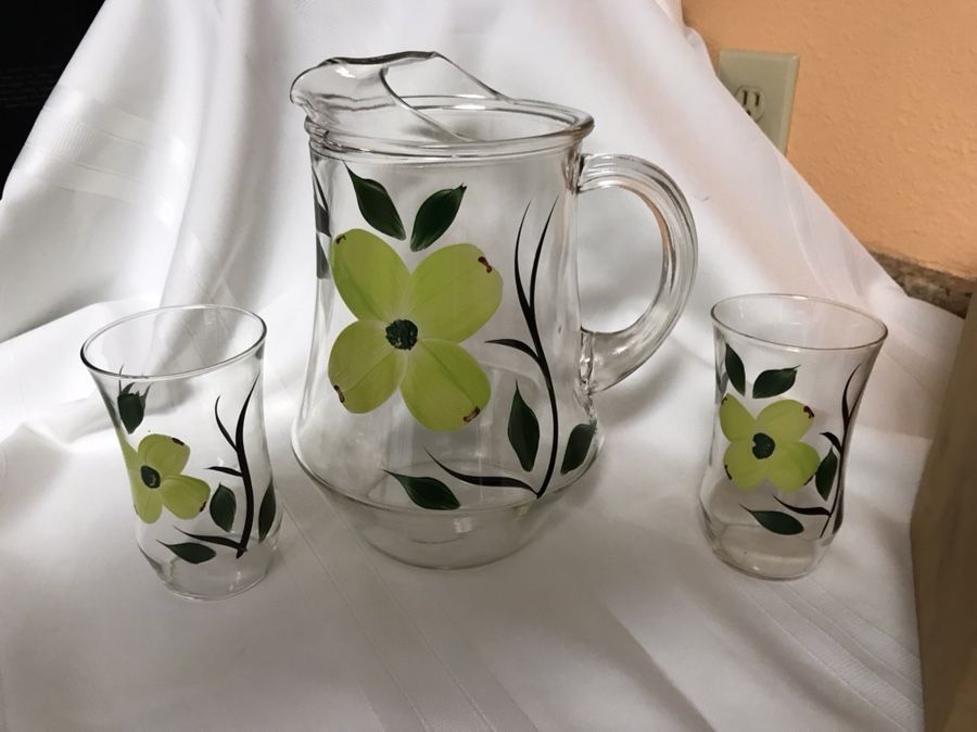 Go-Along with Blue Ridge Original box, two glasses and ice lip pitcher Hand painted- beautiful! Circa 1930-40’s 80 oz pitcher 2-11oz glasses