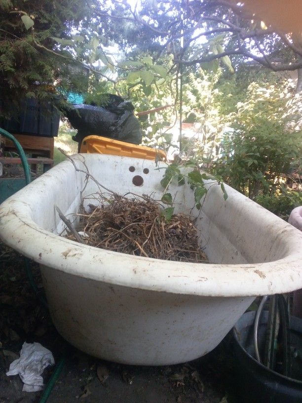 Was being used for a planter and fountain had rocks in it. There are some chips from the porcelain and a little rust there on the inside it doesn't have any feet it's being held up with bricks.