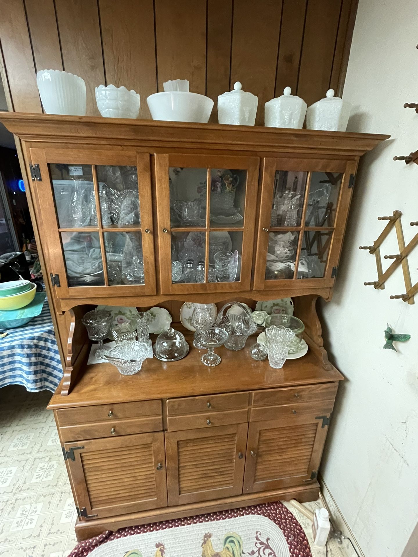 Beautiful Ethan Allen vintage hutch made with solid maple wood. It comes apart into two pieces to make it easier to transport. Outstanding for storing and displaying your favorite dishes or glass pieces. The upper part has one large and one small glassed cupboard with plate groves in the back. The lower part also has a plate drove for displaying favorite plates upright. There is a devided drawer for silverware, candles, etc. The larger drawer is great for table linens. The bottom cupboard opens up all the way across for easy access. There is a half shelf across the entire length for smaller things and a very tall open bottom shelf for taller items. There has only been one owner: it was bought in the early 1970s, and has had excellent care. It would be a beautiful addition to your home for generations to come. Cash only and must be picked up (Adornments not included, just for display.)