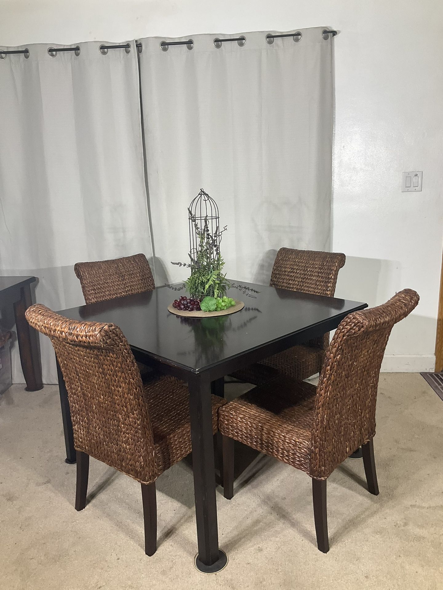 PICK UP ONLY Add a touch of elegance and exotic style to your dining room with this 5 piece dining set. Dark and dramatic, the square 42”, standards height dining table brings timeless appeal, but it’s all about the gorgeous woven rattan abaca chairs with tall backs and straight legs that bring organic BOHO charm! Solid, sturdy construction. Great used condition. Hablo español. #Bohemian, Weave, Seagrass, Rattan, Boho Chic, Coastal