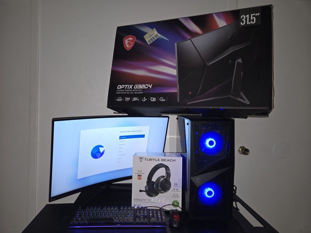 MSI CASE Intel i5 13400f 10core processor Nvidia 4060 8gb gpu 32gb ddr 5 4800 mhz ram 1 terabyte ssd Razer Elite huntsman mechanical keyboard Rgb mouse MSI 165hz optix 32inch monitor Turtle beach stealth pro sealed headset