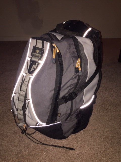Heavy duty backpack with lots of interior pockets. No flaws or rips. Zippers are all in great condition. Reflective material makes this backpack easy to see at night.