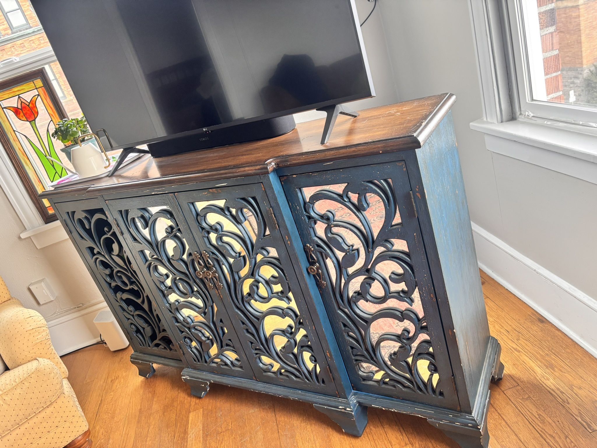 Very beautiful side cabinet The top is made from recycled barn wood The left door mirror broke but can be easily replaced Roughly 4 feet long