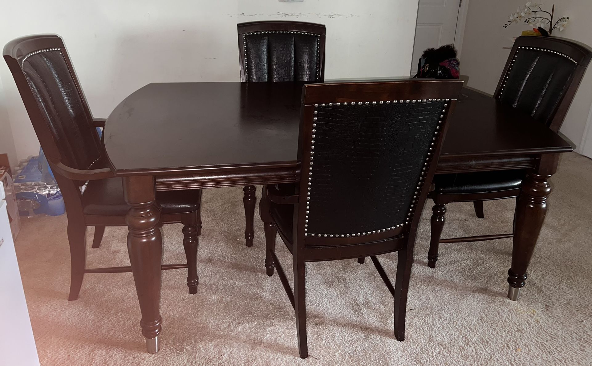 Coffee brown dinning table with 4 chairs. Fairly used. Minor stain